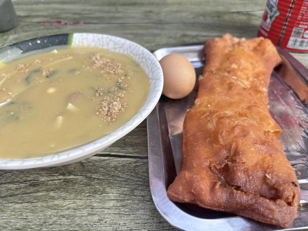 鸡蛋布袋,我本以为会长的很好看。其实应该是将鸡蛋裹在面糊糊里, 然后油炸。说来奇怪,我本以为味道会和油条一样,却差别很大。鸡蛋没有放盐,也更别说甜味了。总的来说就是没有味道。还好之后找到一瓶辣椒,加上才勉强把早餐都吃完了。