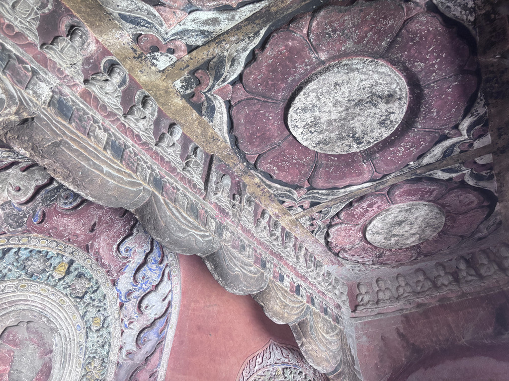 最吸引我的是一些石窟的顶部所刻花纹是佛祖所座的莲花台。吊顶线位置用无数的小佛像雕刻,还有下垂的像帘子一样的部分。刻画细微,无不为之感叹。