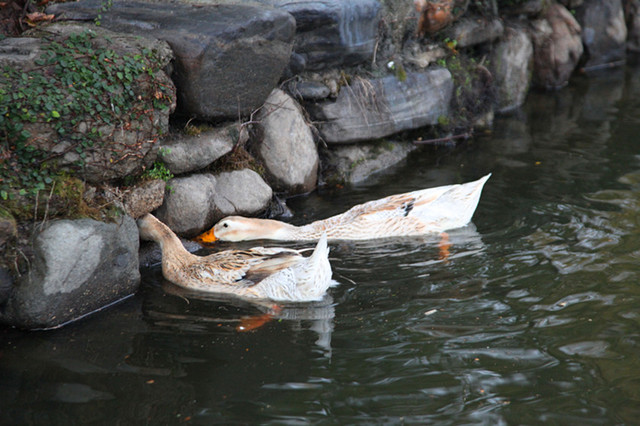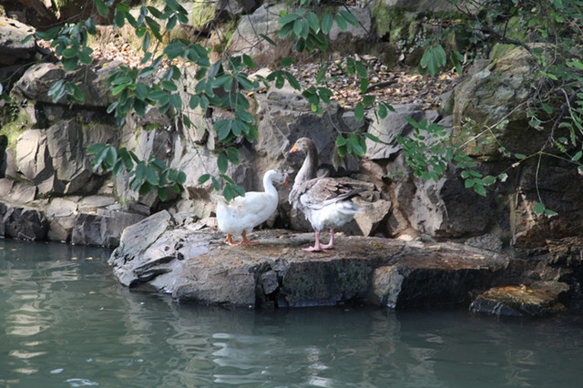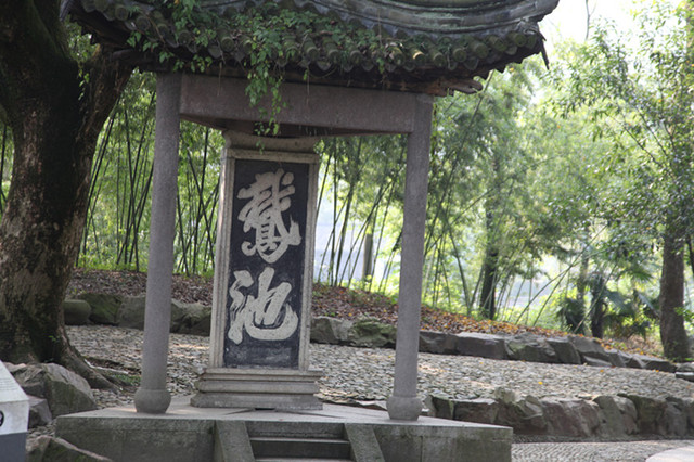 过了检票处不远就会看到写有草书“鹅池”的石碑,相传“鹅”字由王羲之所写,显得娟秀挺拔,而“池”字却较为粗旷、豪迈奔放,是儿子王献之所写,这块碑也因此被称为“父子碑”。来到这里的游客,几乎都会在这里拍照。传说王羲之很喜欢鹅,现在兰亭的鹅池里也养了几只白净的鹅。