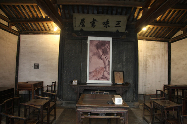 三味书屋是晚清绍兴府城内著名私塾,位于都昌坊口11号。三味书屋是三开间的小花厅,本是寿家的书房。坐东朝西,北临小河,与周家老台门隔河相望。鲁迅12岁至17岁在此求学。当我跨进书屋的时候,没有一点儿陌生的感觉。书屋上面正中有一块横匾,上书“三味书屋”四个大字,据说是清朝著名书法家梁同书老先生题写的。两边有一幅对联,上联是“至乐无声唯孝悌”,下联是“大羹有味是诗书”。横匾之下,就是鲁迅笔下那幅代替孔圣人的“松鹿图”了。