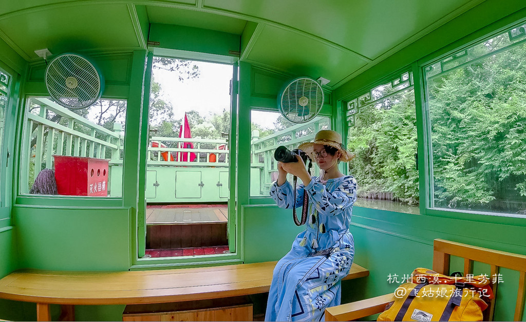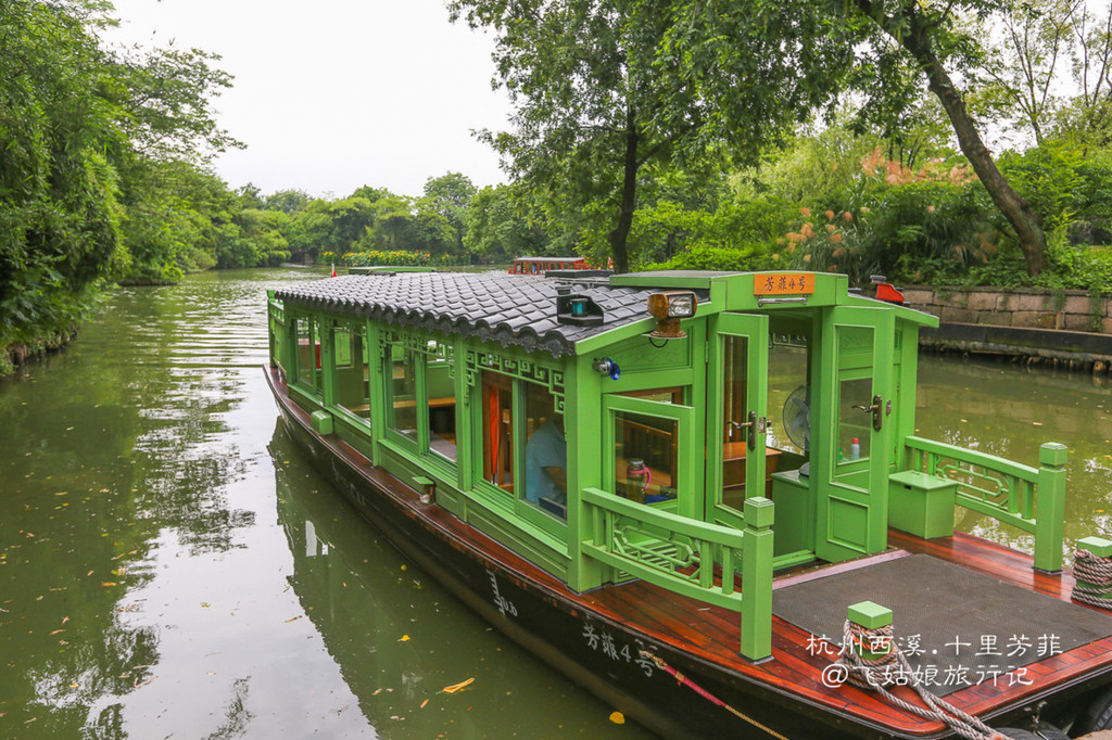 乘坐这样古色古香的芳菲号游船去西溪湿地里面的十里芳菲度假村落