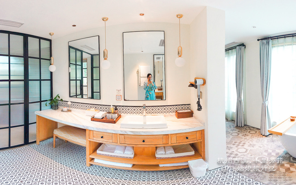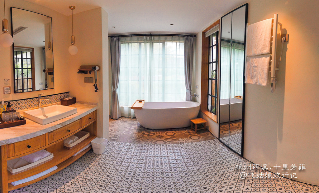 空间特别大的卫浴间双台盆盥洗,和家人一起使用卫生间也不会拥挤,落地大窗边大浴缸,大镜子,地砖很漂亮,电热毛巾架,冬季有地暖戴森吹风机, 日本 的马油润肤露,化妆棉签,卸妆棉, 日本POLA的洗护用品。