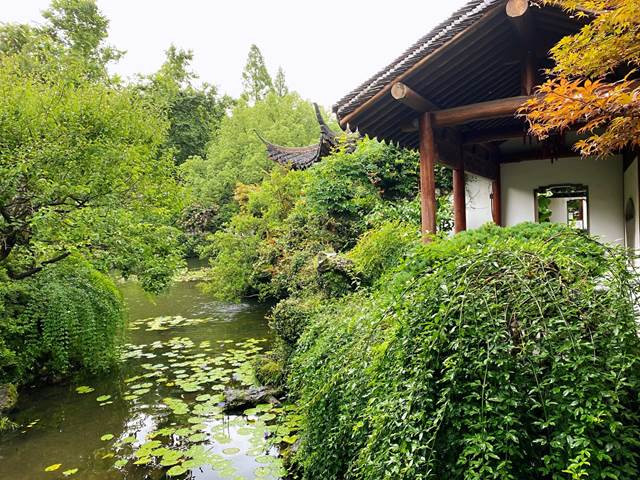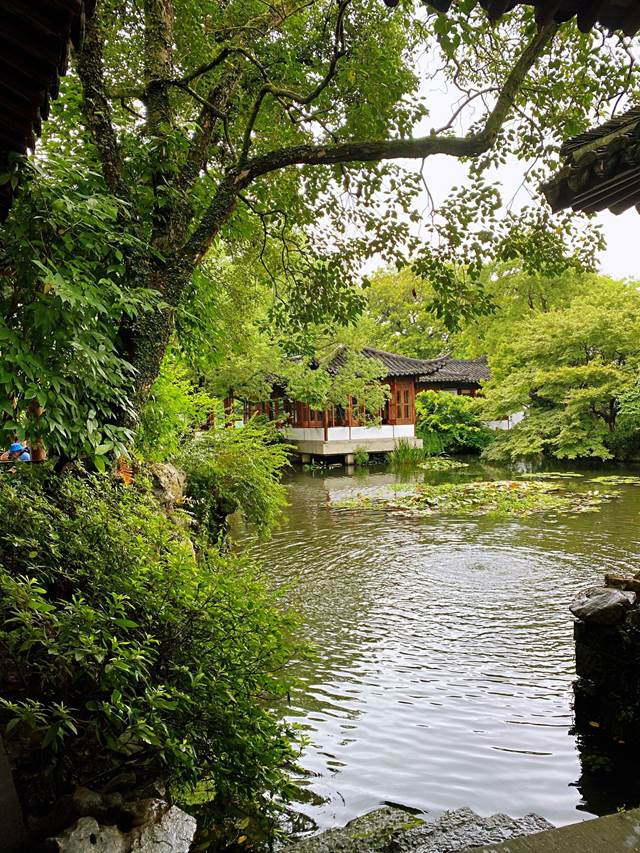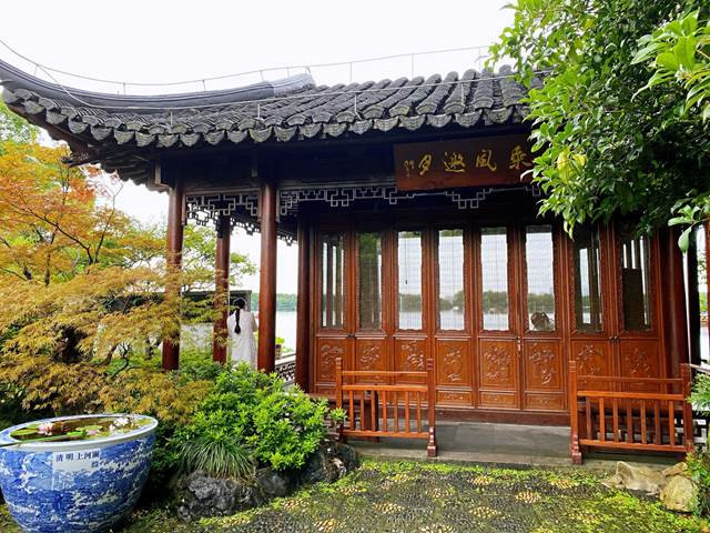 西湖是个特别大的景点。我们去的第一站是郭庄,太好看了。这里好多绿树,叶子垂下来,挡住了湖面,看上去整个湖面变成了弯弯曲曲的样子。湖水上面点缀着一些荷花,看上去更有生机了。