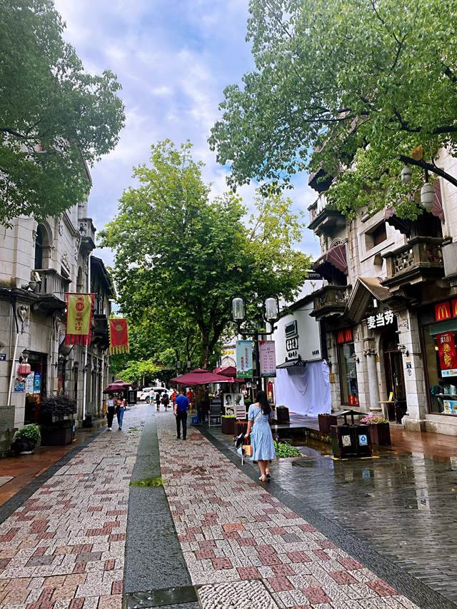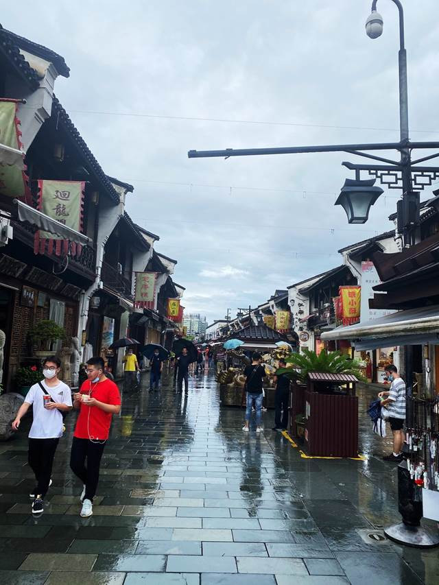 经过了岳王庙,但是并未在里面玩很久。接着我们开车去了河坊街。因为当天下雨了,路上湿漉漉的,拍出来的照片倒是另一种风情了。