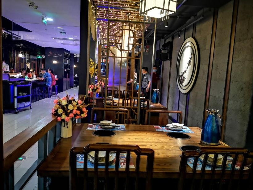中式风格装修,古朴典雅的四人桌,入座后间距宽敞,每人面前的桌上有一个小型的电磁炉中厅还有一个圆弧形的装饰柜,