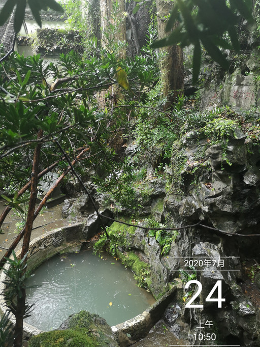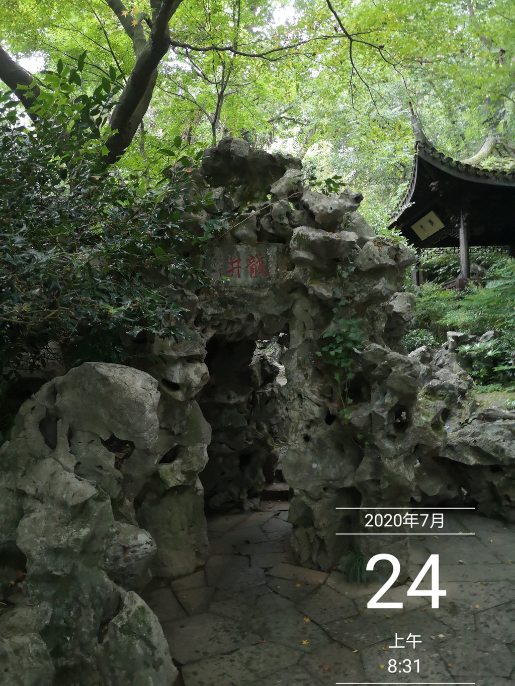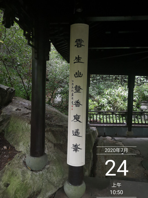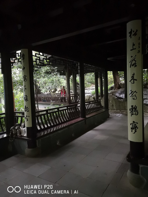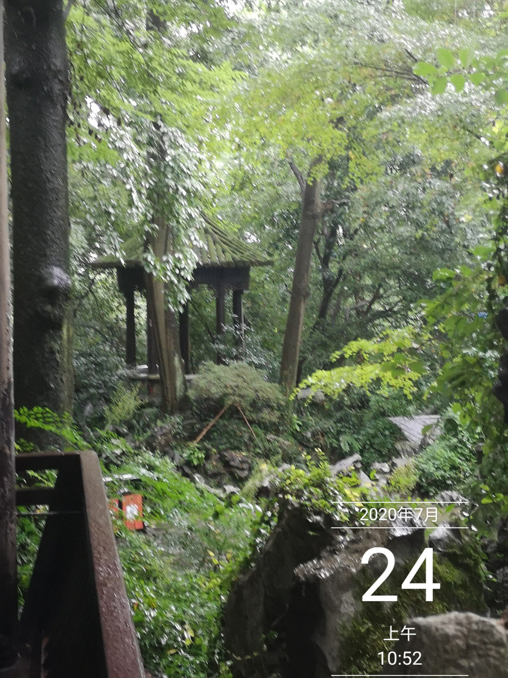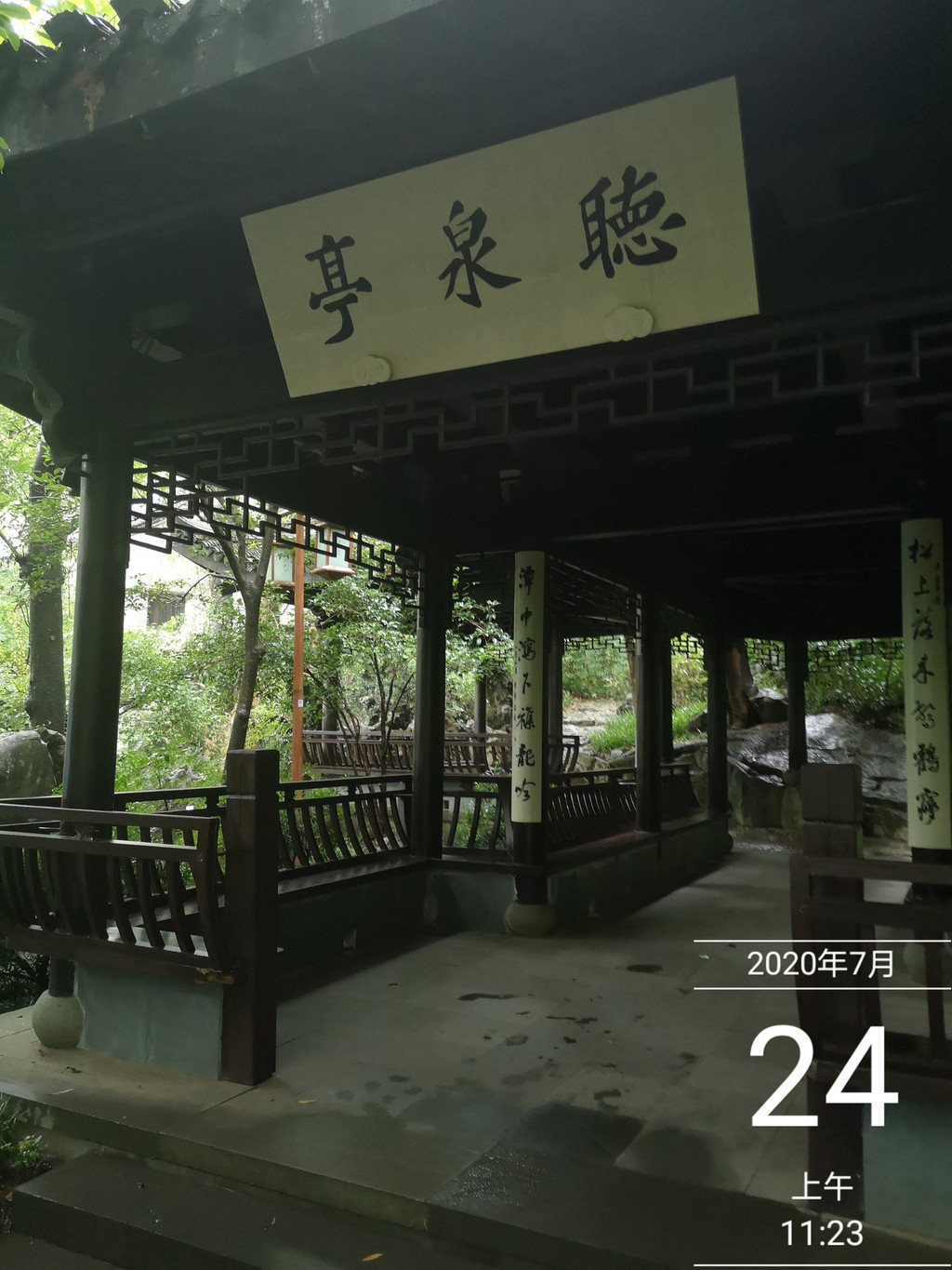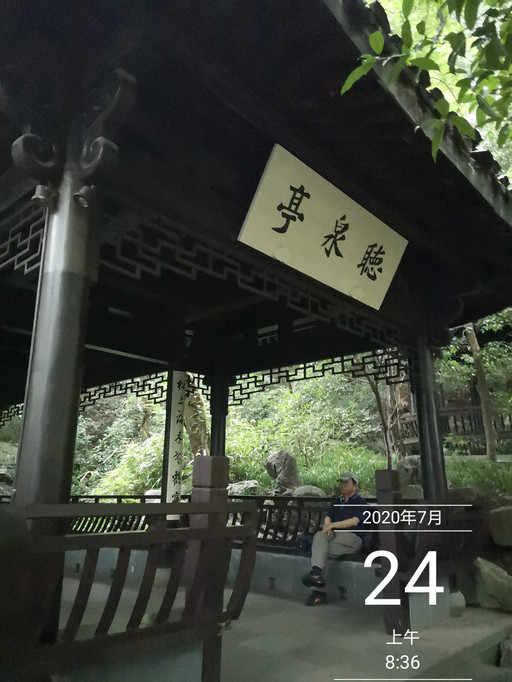 今日不巧,飞檐大殿及几个附属建筑,正在大修。好在转了一圈,大殿北的景区开放,包括龙井。留影之后,淅淅沥沥的小雨变大,于是,我就躲入半山的“听泉亭”,这是一个长廊式的亭子,十分雅致。以前见过,却从未在此小坐。刚刚坐下,吃自带的茶。三五茶客自嘲:蛮好蛮好!不用支付茶钱,听泉变听雨,一样享受,一样享受!
