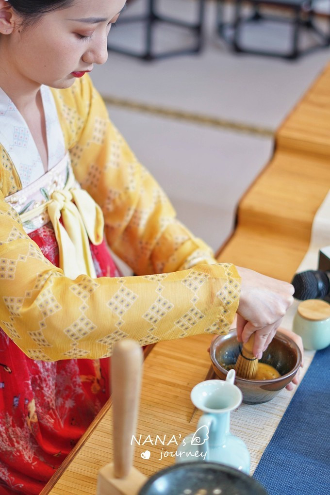 一位小朋友和我们一起学习点茶之法,旁边还有一位古风小姐姐辅助,来完成茶汤的制作,毕竟对于手法的力度要求很高,小朋友力度稍许有些不够呢~