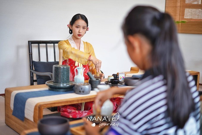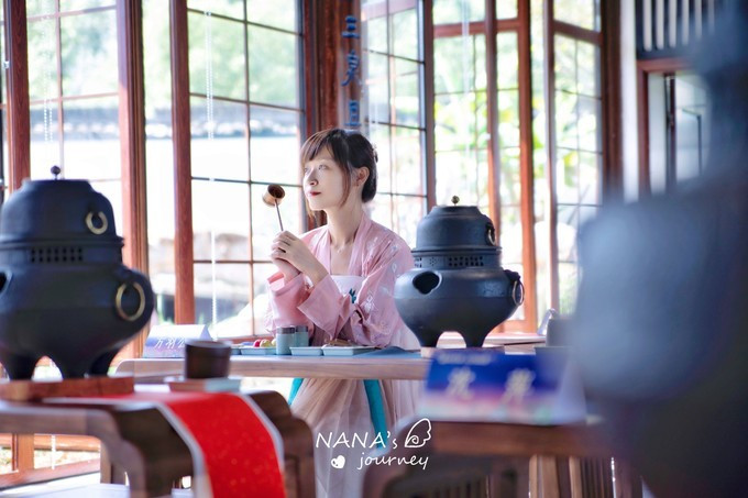 入口处有个古风妹子正在为客人煮茶,大家可以先品尝一下,顺便解暑。