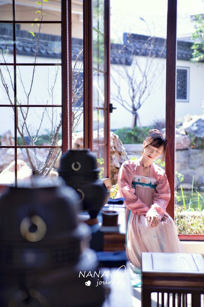 拍照的第一站,肯定是园内网红的小凉亭了,凉亭配了竹帘,乐器表演散场后,也成了大家乘凉赏景的好去处,在这里随手一拍,也能拍出画框中古风人像的感觉。