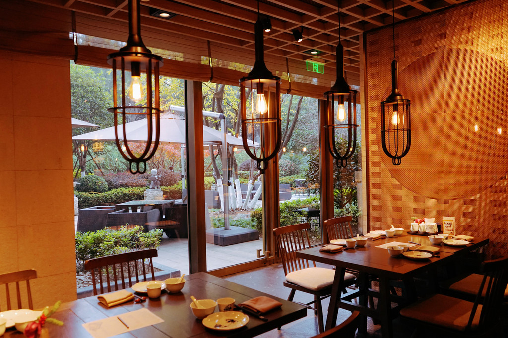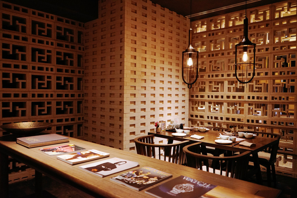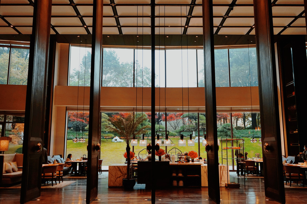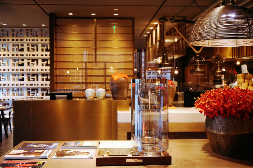 然后,走进酒店大堂,就好像走进了一座精致的江南园林,但同时细节处又能感受到一种皇家气派。酒店入口处被设计成轿厅的样子,一个轿子型的艺术品,使人可以体验到传统的中国文化;再往里走,四根立柱映入眼帘,大堂大气恢宏,但木质立柱的设计又十分简约,只以表面手工制作的纹理和凹凸有致的触感表达生命力和历史感。