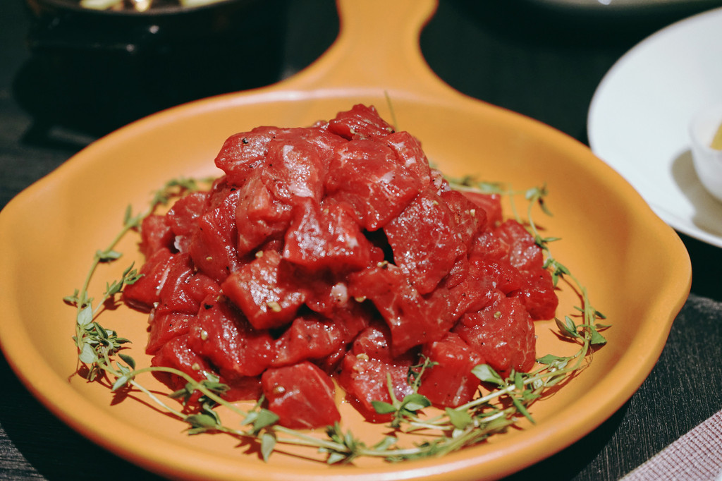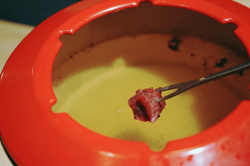 尝试了酒店冬季推出的牛肉火锅,很新颖的吃法,将切成小块的牛肉放进装满油的火锅里涮上10秒钟,就可以吃,蘸上酱料,放入嘴里,好吃到爆炸啊!奶香爆汁的牛肉,是我吃过最好吃的、最香嫩的牛肉了!