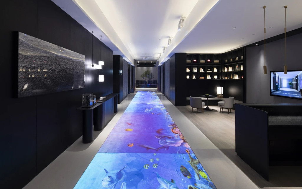 酒店也推出了0秒入住体验,线上预约无需等待,客房搭配“黑科技”可以直接刷脸进入。在酒店随处可见智能科技也极具网红元素,6D全息投影互动沉浸体验,仿佛置身多彩新世界。