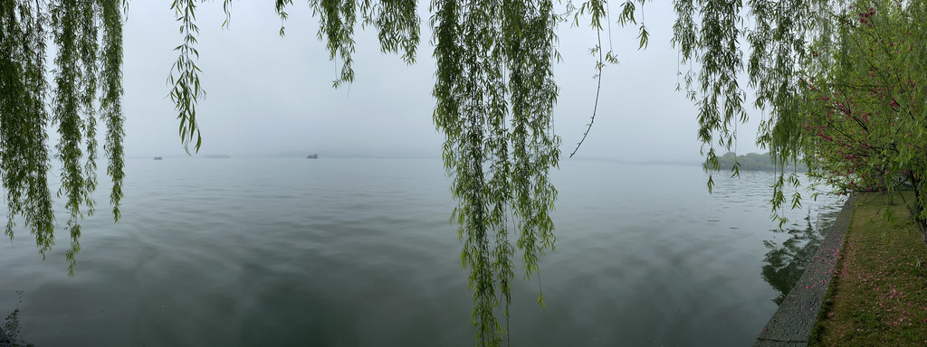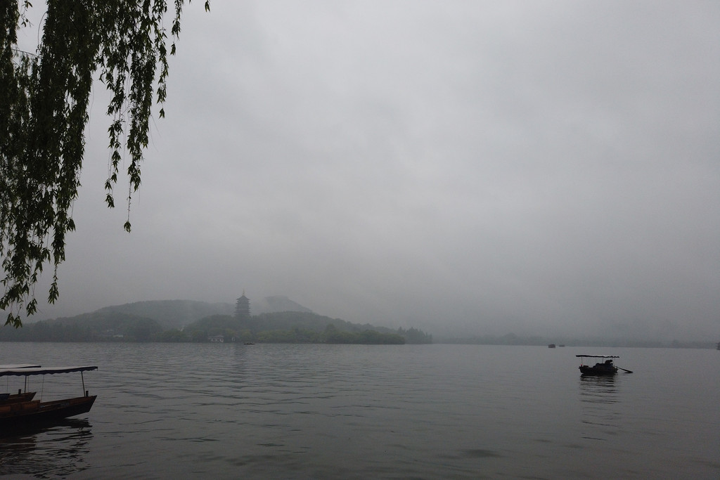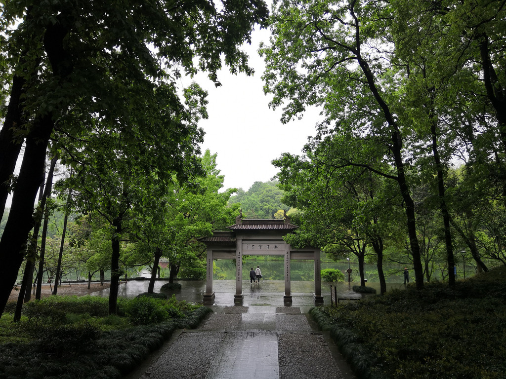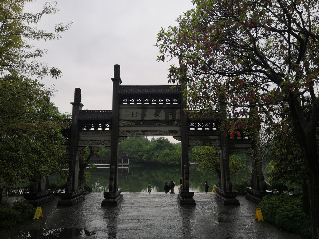 湖滨晴雨 酒店休息了一个小时,赶在16:00,我们四个在酒店大堂集合,想着去河坊街,路径却是涌金公园。涌金公园就在西湖边上,距离不远,须臾之间,西湖已在眼前,山是眉峰聚,水是眼波横,此刻斜风细雨中的西湖山水,正涂抹着一层淡淡的水墨。