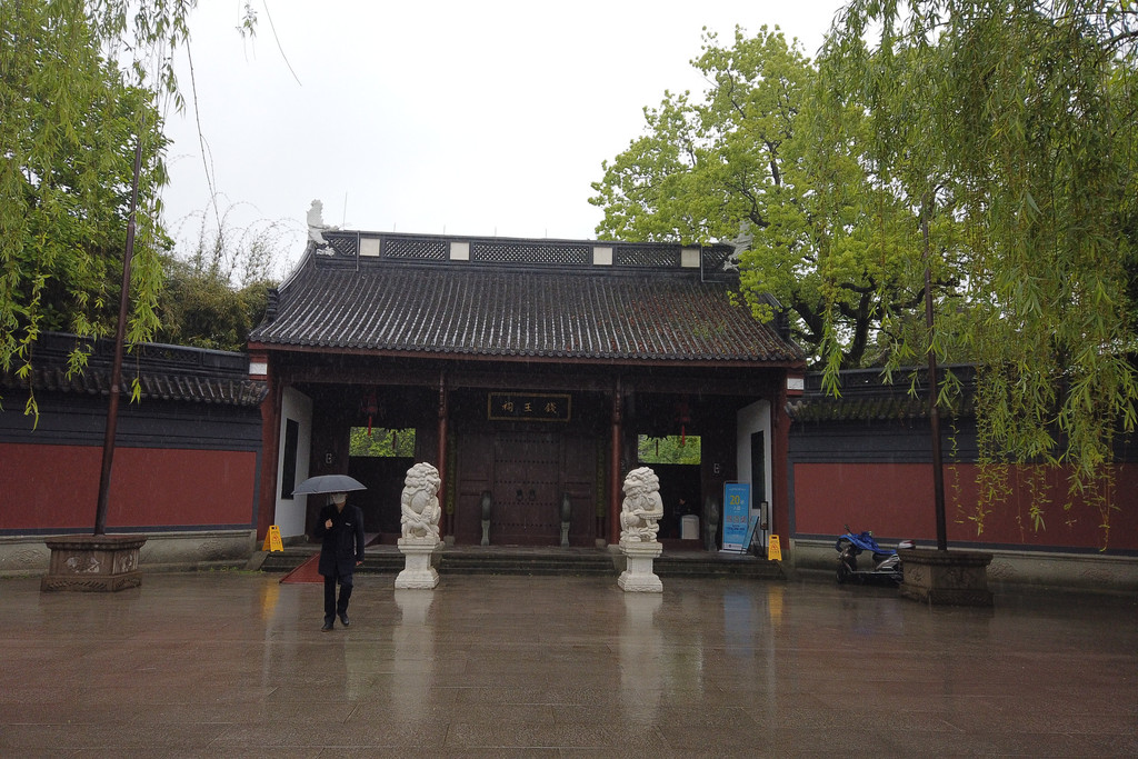 钱祠表忠 钱王祠是我们见过的第一个景观,为表彰五代吴越国王钱氏的表忠观,于北宋元丰二年(公元1079年)始建,清代以后称钱王祠。整个建筑朱户画栋,雕甍飞檐,我们只是在外张望留照,没进到祠内。据说祠内有苏东坡的《表忠观碑记》,中国书法史上著名碑帖,不可多得的国宝。