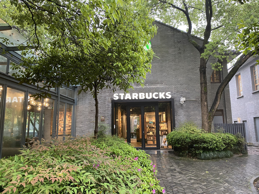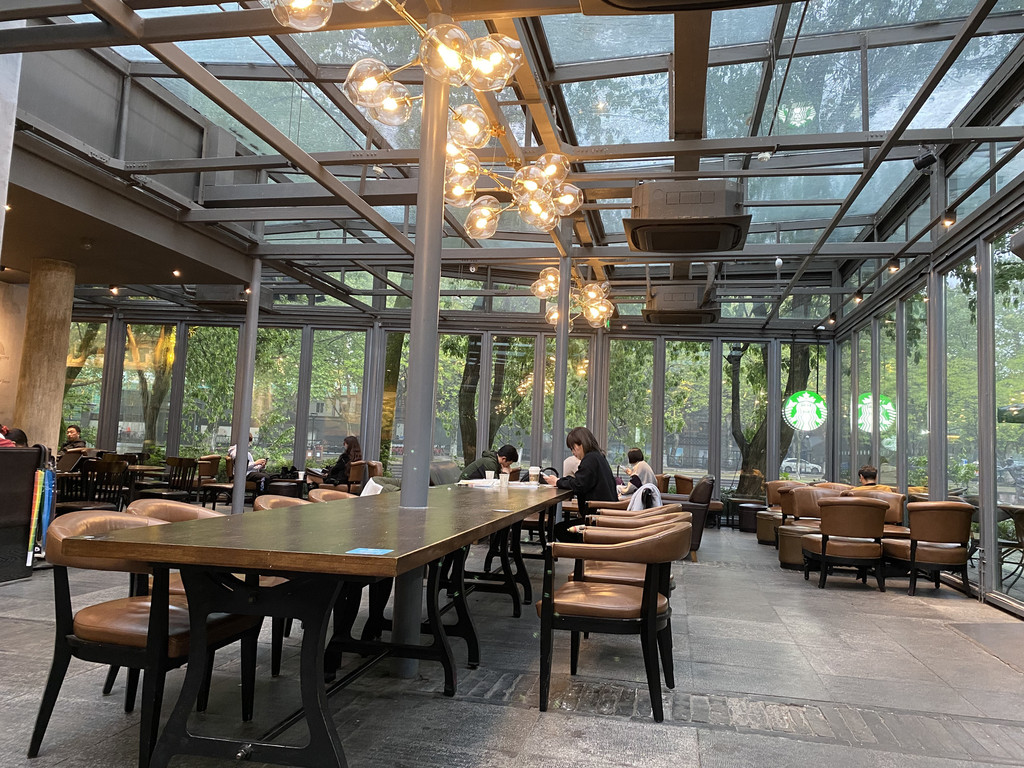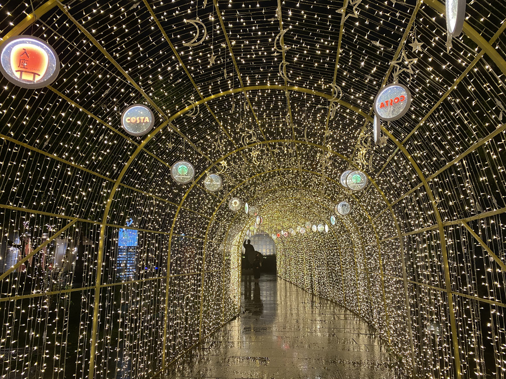 顺便注意了一下,室外露天的服务生竟然都是男生,你是女生就管室内。晚餐结束已是18:00,我们在西湖天地转悠一圈,一处时光隧道,我们顺道来到星巴克。