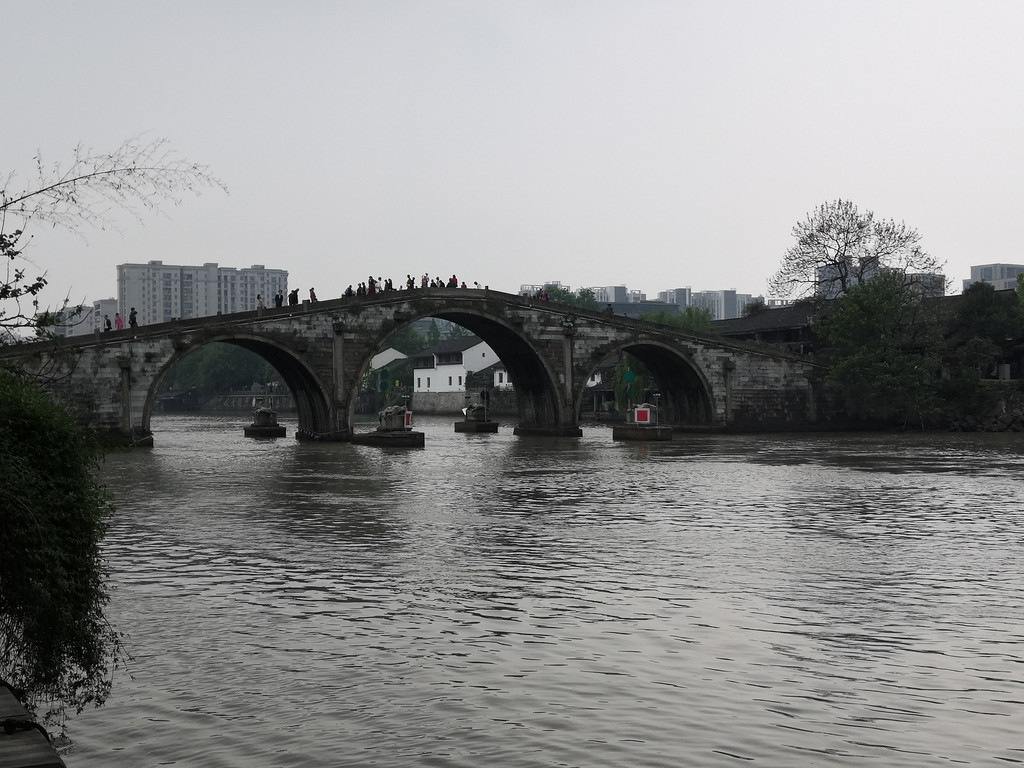 拱宸桥三孔联拱,亮眼吸睛,是杭州古桥中最著名的一座,也是京杭大运河抵达杭州的终点标志,拱宸字面形象,最高规格的拱手迎驾,最高最宽最长。所谓最高,其16m的高度,在当时的杭州可谓是鹤立鸡群一般,站立其上可以望远杭州吴山西湖,可以俯瞰桥西巷里民居。所谓最宽,其桥堍极致12m,桥身极致6m,有台阶,设坡道,人行货运,互不相妨。所谓最长,桥长98m,三跨过河,偌大的运河,其奈我何?三最合一,故而人流熙来攘往,我们站在了最高,我们跨过了最长,至于说我们丈量了最宽,从北望帝京,到回眸杭州,迎来送往许许多多的船队航运,其中包含多多少少的茶叶丝绸由此完成了通商,我们丈量的宽度,是历史的宽度,也藉以算是过了这最后一关。