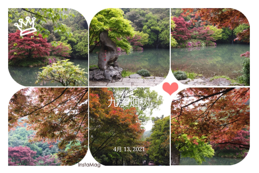 这是怎样的景致?清湾、宏法、唐家一众九溪,或平流,或跌水,源源不断,汇聚溪中溪,形成大大小小的一片湖区,浅者若洳,筑有丁步,湍者如濑,置以柯桥,蒲藻浮动于水,嘉树傲立于渚,溪中溪前,突兀一峰湖石,题书九溪烟树,游客纷聚,未有暇时,取照留影,只需你的明眸,这可真难为红透溪水的簇簇枫叶。