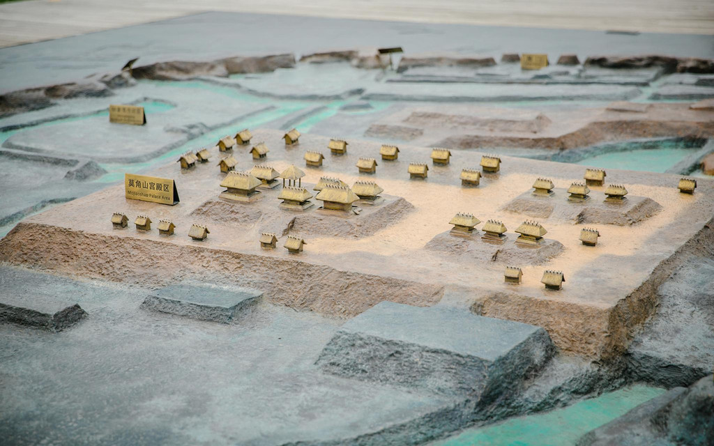 整个莫角山宫殿呈矩形覆斗状,利用自然山体人工堆筑而成。其上分布有三座宫殿台基,呈三足鼎立之势。西北为小莫角山,东北为大莫角山,西南是最小的乌龟山。整个宫殿区堆筑土方量达200余万立方米,堪称中国最早的“紫禁城”。