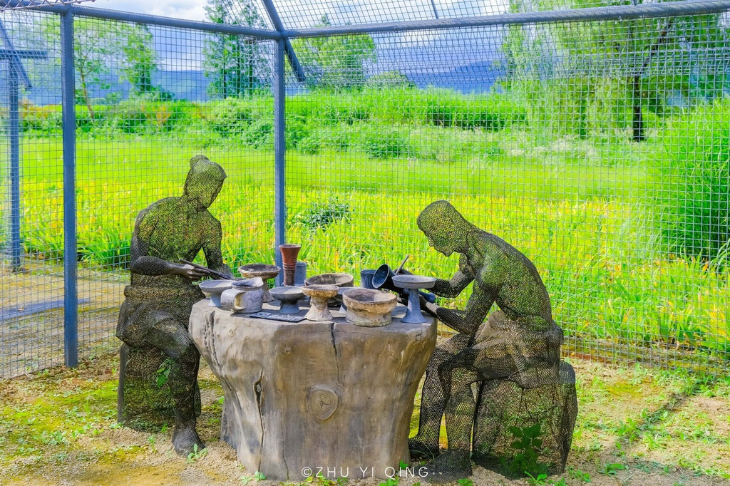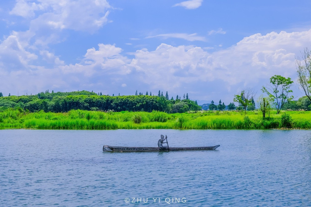 河面上也有座当年良渚人划船时的雕塑,远方的蓝天白云,近处的草地湖水,将我一下子带回了那个年代。