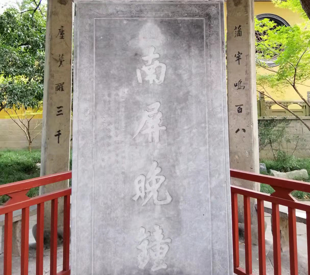 “南屏晚钟”为清康熙三十八年(1699),圣祖玄烨南巡时手书。由总督郭世隆、巡抚张敏等于寺门外建亭立碑。康熙御题的左下方有一段文字:总督福建浙江等处地方军务兼理粮饷兵部右侍郎兼都察院右副都御史臣郭世隆。巡抚浙江等处地方提督军务都察院右副都御史加二级臣张敏。日讲官起居注詹事府詹事兼翰林院侍读学士加五级臣高士奇恭摹。相传当初康熙题碑时,改“南屏晚钟”为“南屏晓钟”,后杭人偏爱晚钟,便仿康熙御笔,把“晓”字改回了“晚”字。