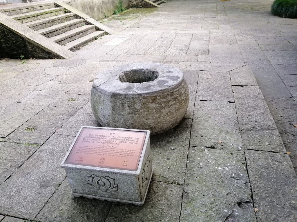 钟楼前种有两棵娑罗树。据史料记载,佛祖释伽牟尼生于无忧树下,在菩提树下悟道,娑罗树下涅槃。后世佛教徒为了纪念佛陀一生中三个伟大时期,都习惯在寺院里根据当地气候的许可有选择地种植这三种圣树。树荫下东西两侧有两眼水井,是南宋绍兴四年(1134)由住持石田法熏大和尚以禅杖叩地凿出的水井。在法熏开凿双井之前,寺僧饮濯用水必须到湖边挑运。法熏方丈看寺僧很远去湖边挑水非常劳累辛苦,便决定在院内掘泉出水,以解急需。某日,召集僧众和工人在大殿前东西两侧,以锡杖叩地,祝愿说:“井于斯,泉于斯”,命人在他指点的地方用工具进行开凿,倏忽,泉水从地下喷涌而出,众人惊喜之余,用砖砌以井壁。此双井所出泉水,非假道于江,非借资于湖,碧绿清澈,源而独出。不但水甘如酥,而且旱涝无增减,一年四季始终保持在一个水位。依靠这两眼神泉,从此解决了寺僧钦用和洗濯用水,并起到寺院消防作用。