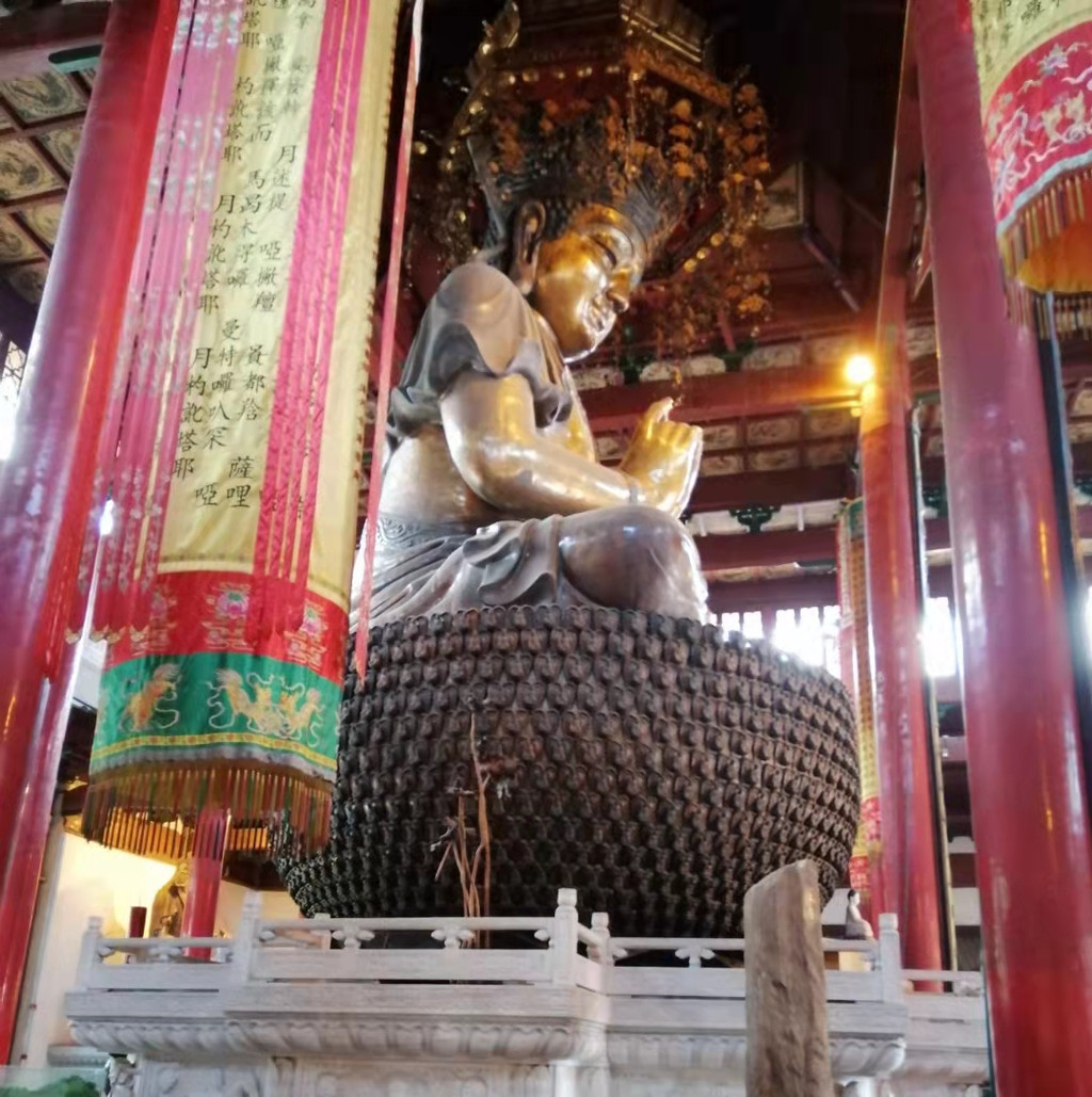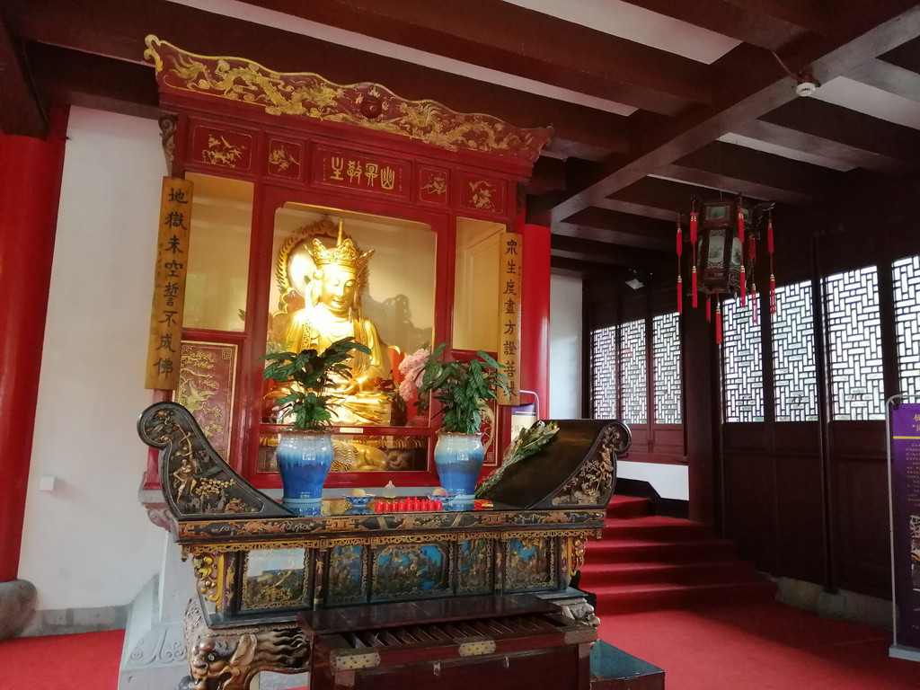 进入钟楼,钟楼的底层供奉的是地藏王菩萨,地藏王菩萨的修行已经圆满,本来是可以成佛的,但是他曾立誓说,在释伽牟尼涅槃,弥勒佛尚未出生的五十六亿七千万年间,由他看守地狱,一日地狱不空,他一日不成佛,因此至今为止,他还只是菩萨的阶位。释迦牟尼在仞利天为其母摩耶大人说法时,嘱地藏菩萨长住世间,任命他为幽冥教主,救济三恶道众生之苦。大钟下供奉地藏菩萨正是遵循释迦牟尼佛的教导,所以打钟的僧人口称“南无幽冥教主大愿地藏王菩萨”名号,随称名号随打钟,使三恶道一切受苦众生,闻钟声皆得仗地藏王的本愿慈力而脱离一切苦。