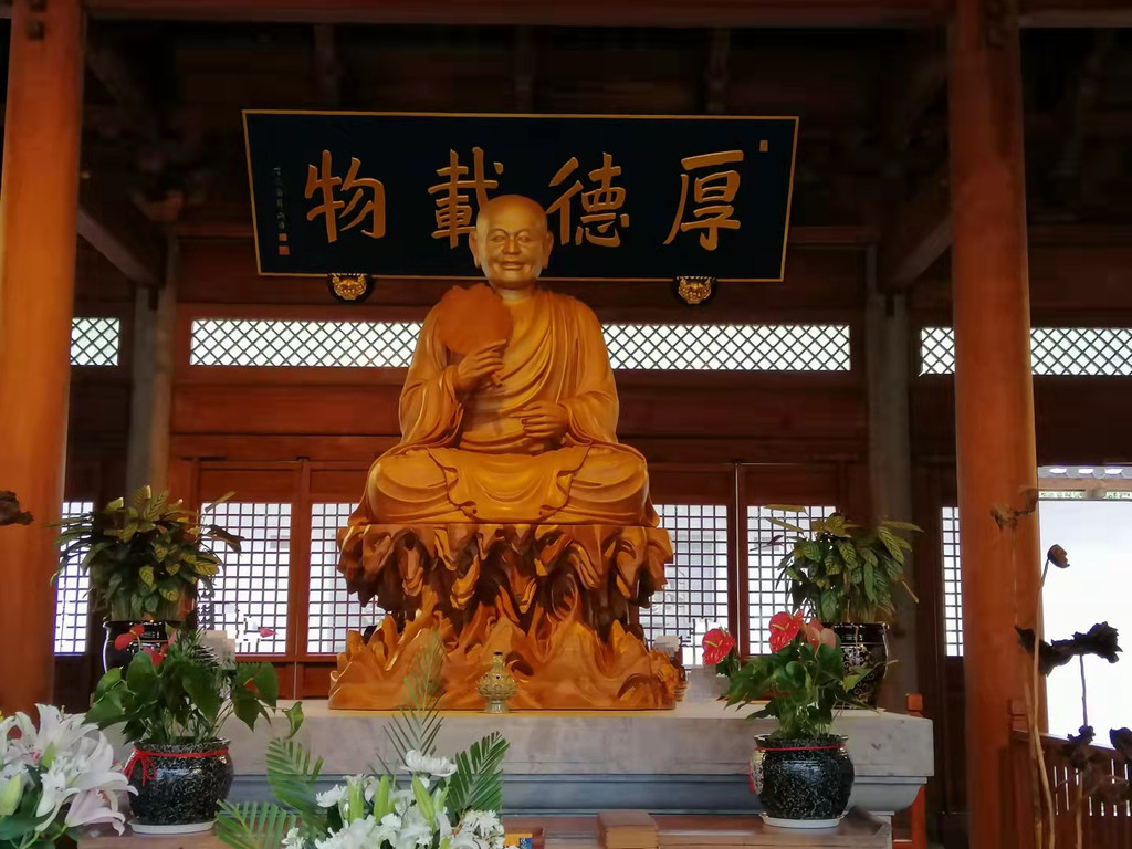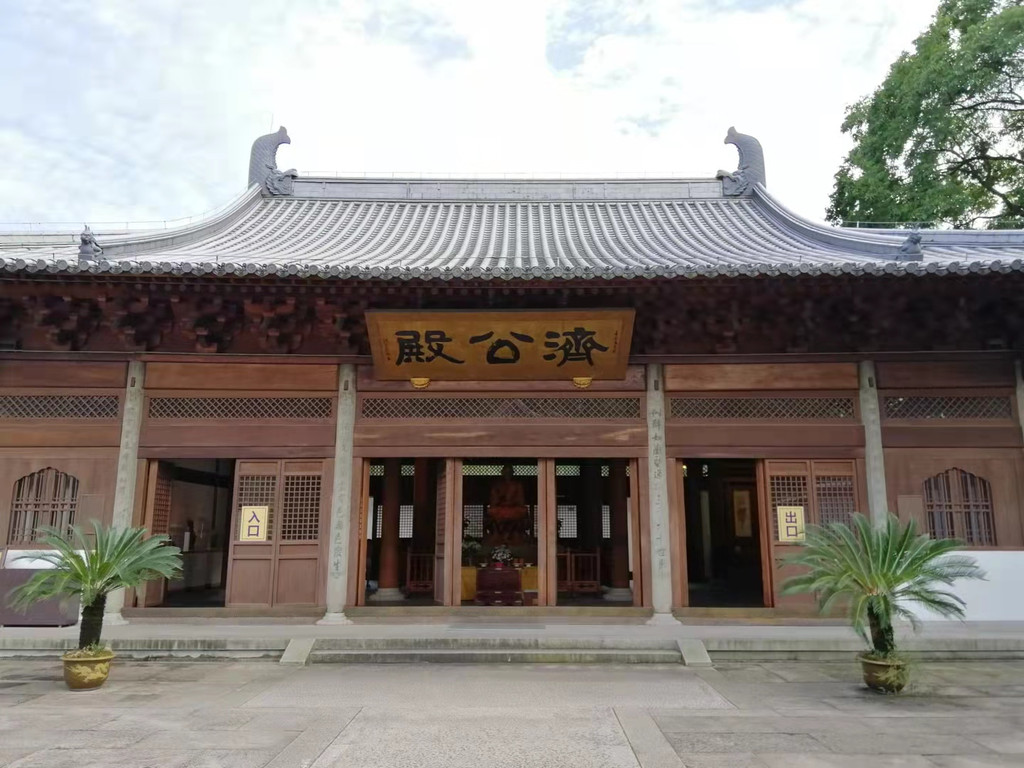 进入济公殿,殿内大门上方匾额:“游戏神通”,后面上方匾额:“厚德载物”。因为流传于民间的济公印像不是道济祖师的本尊形象,不能彰显祖师之德,所以,如今供奉于济公殿主位的是“经寺院多方商榷,以清竹禅法师之画,再入造像之法,加以德者之范,故现殿中法相。”