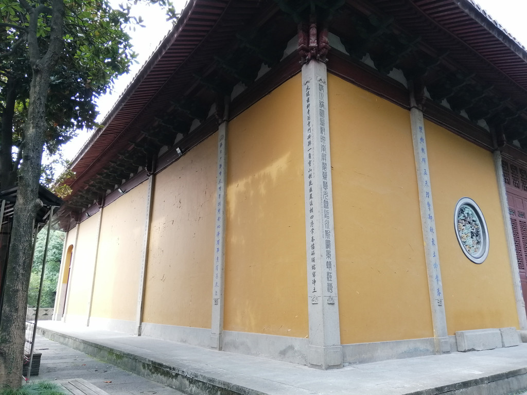 背面中间的楹联是有“近代颜书大家”之称的谭延闿所题:“净理胜因,愿从今日称居士;慈恩慧业,长与名山作主人。”背面第二副为:粪翁题:“问何人与禅定法喜为缘几时探寂随机重见三十二种如来宝相;惟是处有绿水青山可住好约闲云孤鹤来听一百八下慧日钟声。”背面第三副为太虚题:“六桥烟水,三竺香云,正觉南屏钟破晓;双树戢晖,五天潜响,欲欣东土佛常春。”背面第四幅为伊觉任题:”宝刹镇临安代传西竺缁衣密义广宣长此象形卷湖月;洪川称明圣对映南屏翠幕慧光普照永斯风景靖江潮。”东侧墙面第一副为:“佛旨自圆融像教东来若人入塔庙任他谤佛骂佛尽成佛道;因果一顿渐法幢再起是谁修福德无论遍因报因皆是因缘。”东侧墙面第二副为金汤侯题:“香刹净梵千年空即是色色即是空一切世间若能书写诵读受持得种净因自成净果;佛法慈悲一道古不异今今不异古诸天菩萨以无我人众生寿者大开慈宇普度慈航。”东侧墙面第三副为潘天寿题:“塔飞山坐,一样空华,今逢末世万年,初如是道场,愿尔众生圆觉;珠照灯传,三轮真谛,顿悟现前四大,假傥求法相,莫忘蒭境庄严。”西侧墙面第一副为高振霄题:“山河大地露法王身南北高峰看天目西来江流东去一笑证前因无非净觉;凡圣含灵现平等相颠狂神迹伴苏堤遗爱岳庙精忠三仁得妙果即是慈祥。”西侧墙面第二副为芝峰题:“踢去夕阳,喝来明月,试问南北峰顶,毕竟有甚来去;朝生虫臂,暮死鼠肝,且看宇宙源底,陶然不落死生。”西侧墙面第三副为:“大堤垂柳,青到寺门,安排一角灵山供养,庄严法相,四序常春,仅好湖堧留净土;前坞斜阳,红分莲座,照彻八功德水转旋,寂默金轮,六时俱念,又从云外吼清钟。”上海虬盦火雪明甫题。
