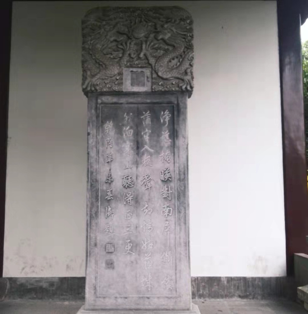 山门西侧的御碑亭为一座古色古香的四角攒尖顶木亭,亭中的石碑,四面都是是乾隆皇帝的题诗。乾隆十六年,清高宗下江南,为西湖十景题诗,其中的“南屏晚钟”诗也刻于石碑上。乾隆御诗碑的正面诗曰:“净慈掩映对南屏,断续蒲牢入夜声。却忆姑苏城外泊,寒山听得正三更。”其余三面也皆为乾隆题诗:“绣峰南面正开屏,净色兼之发净声。我听未能息诸虑,宵衣问政惕深更。南屏晚钟 壬午春 题再叠前韵。”御碑背面也镌刻着乾隆皇帝的诗:“月色罘罳清映屏,南风岂得夜钟声。时巡展义真由旧,政化无烦在率更。”和“湖山四面画为屏,合有钟声警众声。唐宋至今诸物改,霜天惟此未曾更。南屏晚钟 丁丑春御题叠前韵。”