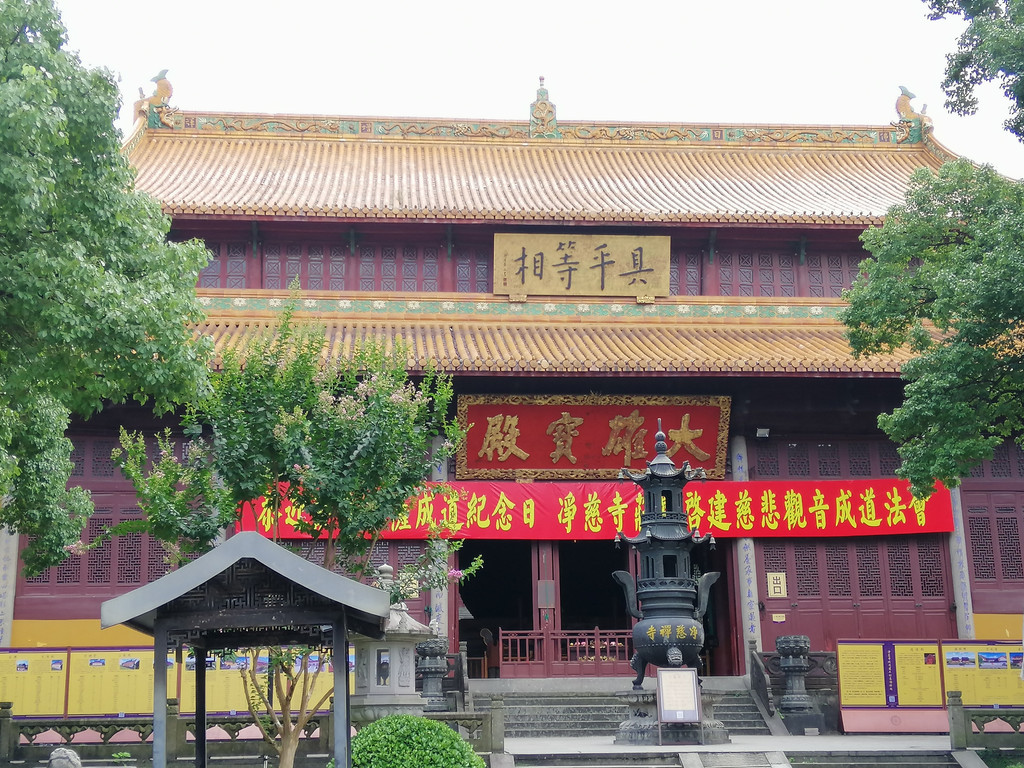 大雄宝殿是净慈寺的中央主殿,高十三丈,建筑面积1260平方米。大重檐歇山顶建筑,黄色琉璃瓦屋顶,雄伟端正庄严。大雄宝殿重檐之上有“具平等相”匾额,有一个故事,说是一位得道高僧,在打坐参禅时看到一只鹰捕捉到一只兔子。兔子因为害怕苦苦向高僧哀求。高僧对鹰说,“你把它放了吧,你要吃肉就从我身上割去好了。”说完拿出一个天平,把兔子放在一端,但是无论怎么割天平就是不肯平衡,直到高僧放上了自己的最后一口气,天平平衡了,即众生平等。大殿于后周显德元年首建,南宋绍兴初被毁,由道容奉召来净慈寺重建。未几又毁,隆兴年间,宋孝宗赐金重建并增建“慧日阁”,御书阁额。嘉泰四年(1204年)再毁,曾由寺僧道济等化募重建,于嘉定十三年(1220年)由宋宁宗敕住持妙崧重建。元至元二十七年(1290年)毁,由住持至慧重建。明洪武十一年(1378年)住持夷简曾修葺寺宇,重建钟楼。明洪武二十五年(1392年)二月毁,住持祖芳道联向士绅募化集资开始重建,经希古师颐等历代住持连续修建,直至永乐八年(1410年)才完成。永乐十四年(1416年)由杭城缙绅资助整修。至宣德五年(1430年),大殿又毁,由觉庵宗妙募化重建,四年落成。