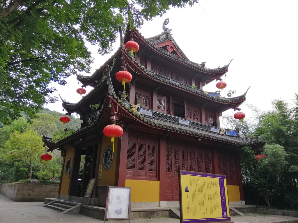 从金刚殿出来,西侧就是著名的南屏晚钟的钟楼。杭州著名的西湖十景之一的南屏晚钟就是这里叩响的。净慈寺的钟声在历史上久负盛名。唐代诗人张岱“夜气滃南屏,轻风薄如纸;钟声出上方,夜渡空江水”的诗句就已把净慈寺钟声的美妙写得出神入境了。钟楼为三重檐歇山顶二层建筑,建筑飞檐翘角,雕梁画栋,古朴优美。净慈寺初建时就设钟楼一座,明代洪武十一年(公元1378年),寺院住持夷简重建钟楼时,觉得旧钟太小了,就化缘积铜二万多斤,重铸大钟。每日傍晚,夕阳西下,暝色苍茫,佛寺晚钟敲响,108声深沉、浑厚的钟声在苍烟暮霭的群山碧空中回荡,响彻云霄。由于南屏山空穴怪石较多,钟声经石穴回荡互激,钟声传播到十多里外,飞向西湖上空,直达西湖彼岸,碰上对岸由火成岩构成的葛岭,回音迭起远飘大半个杭城,故有“南屏晚钟”景致。可惜在清朝末年,铜钟在战乱中消失,钟声沉寂。