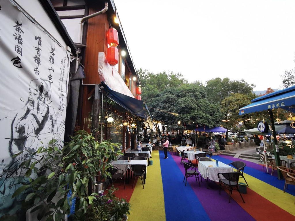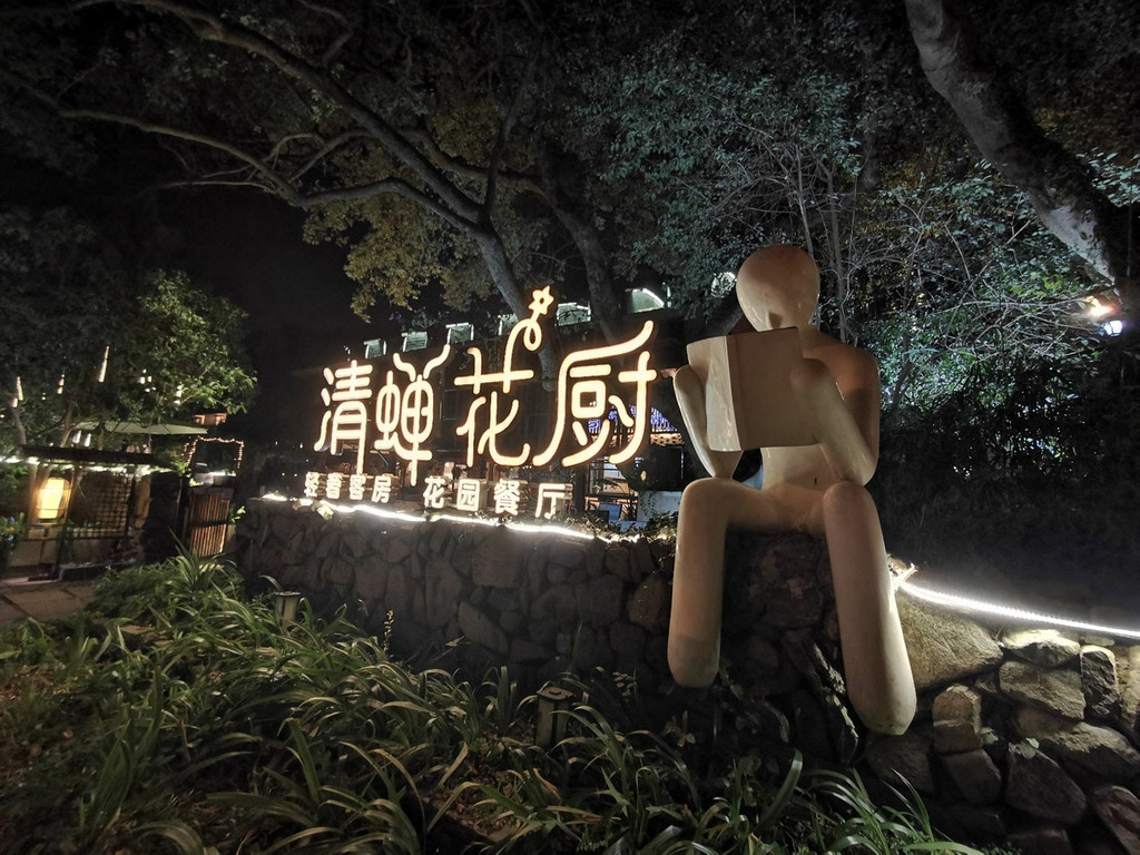 周边隐藏在高大的树木之中,夜色阑珊处的“清蝉花厨”在幽静的满觉陇也