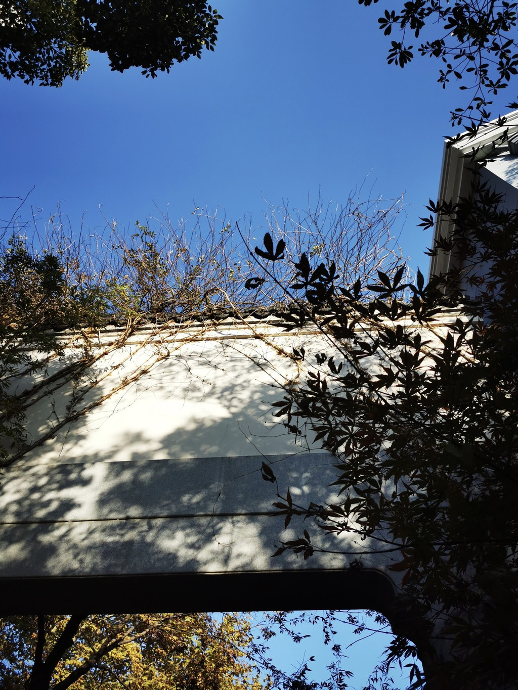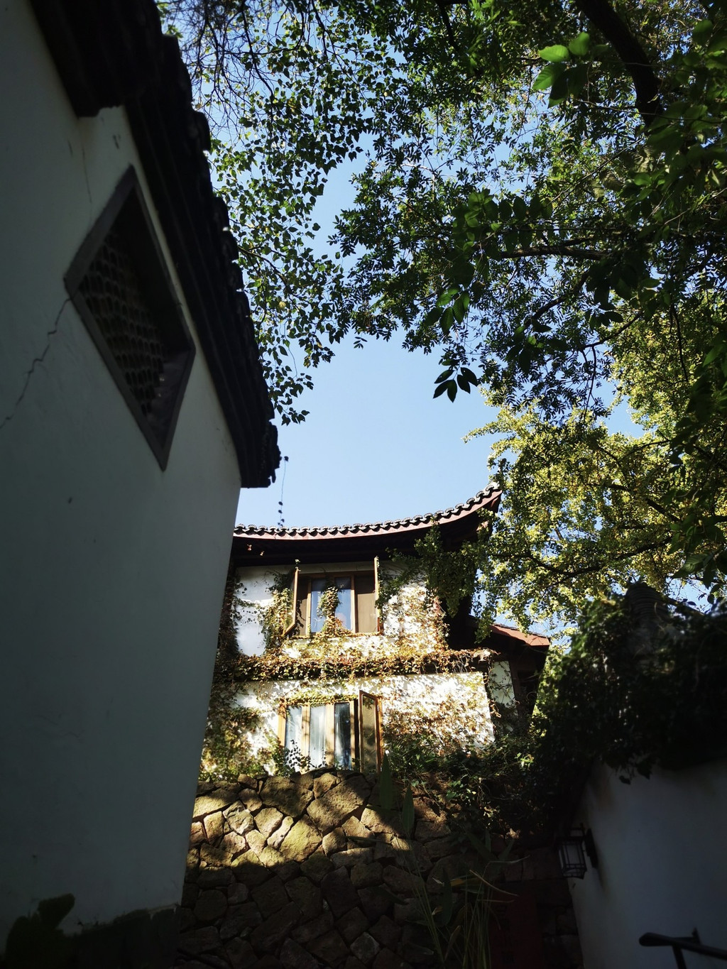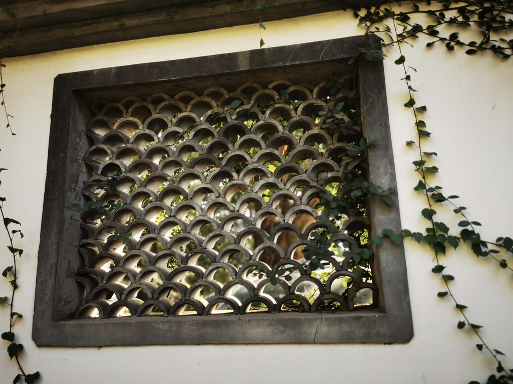 白墙上的石头窗户爬满了青色的藤蔓