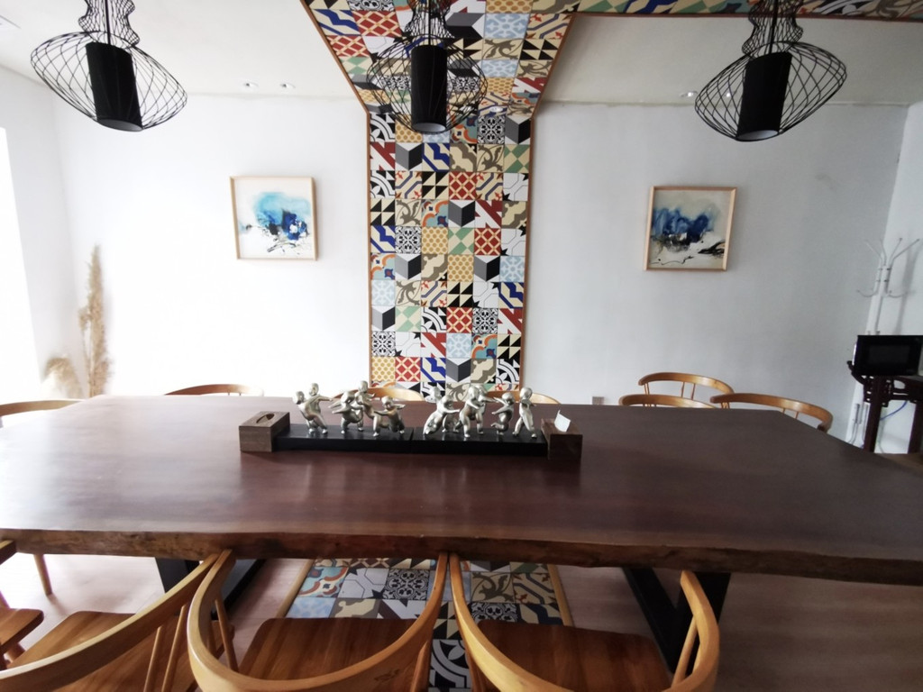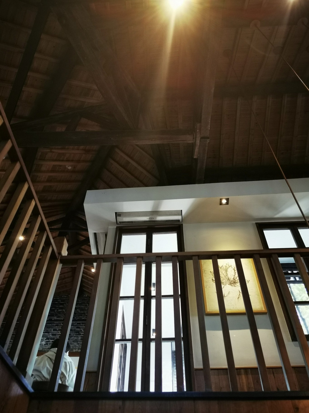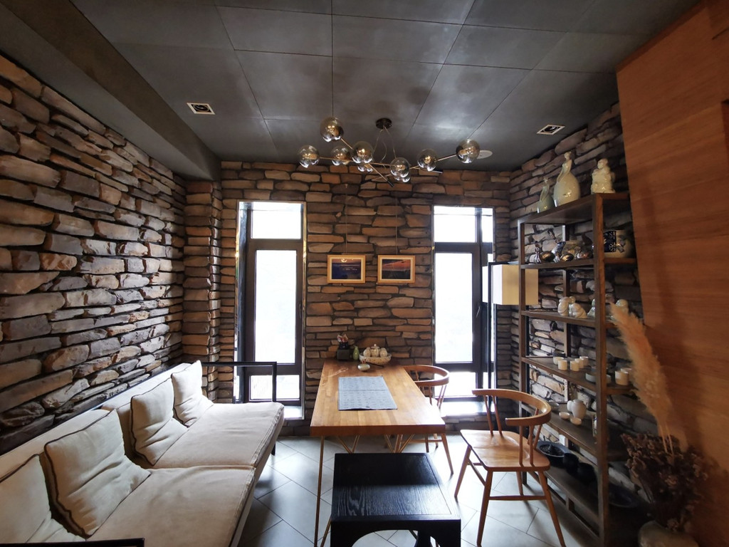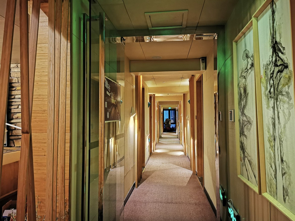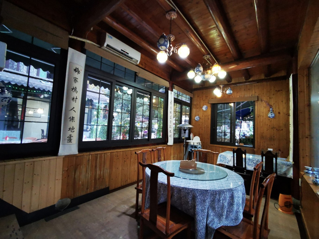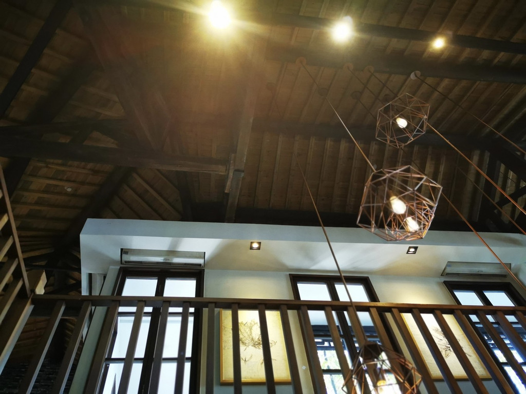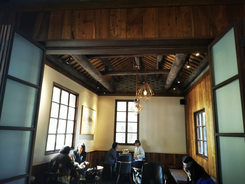中式的木制高顶,一点都不会感觉到压抑感,四周的木制田子格玻璃窗,增加拉采光性