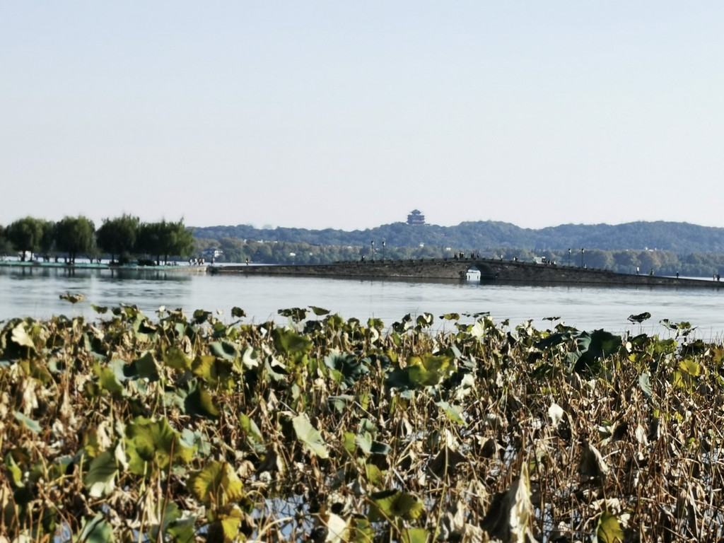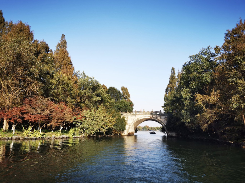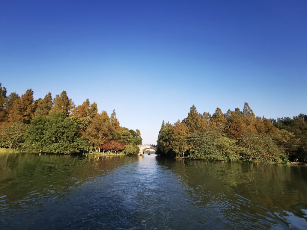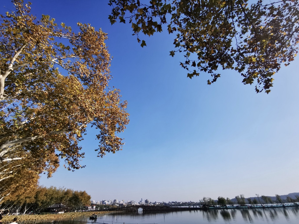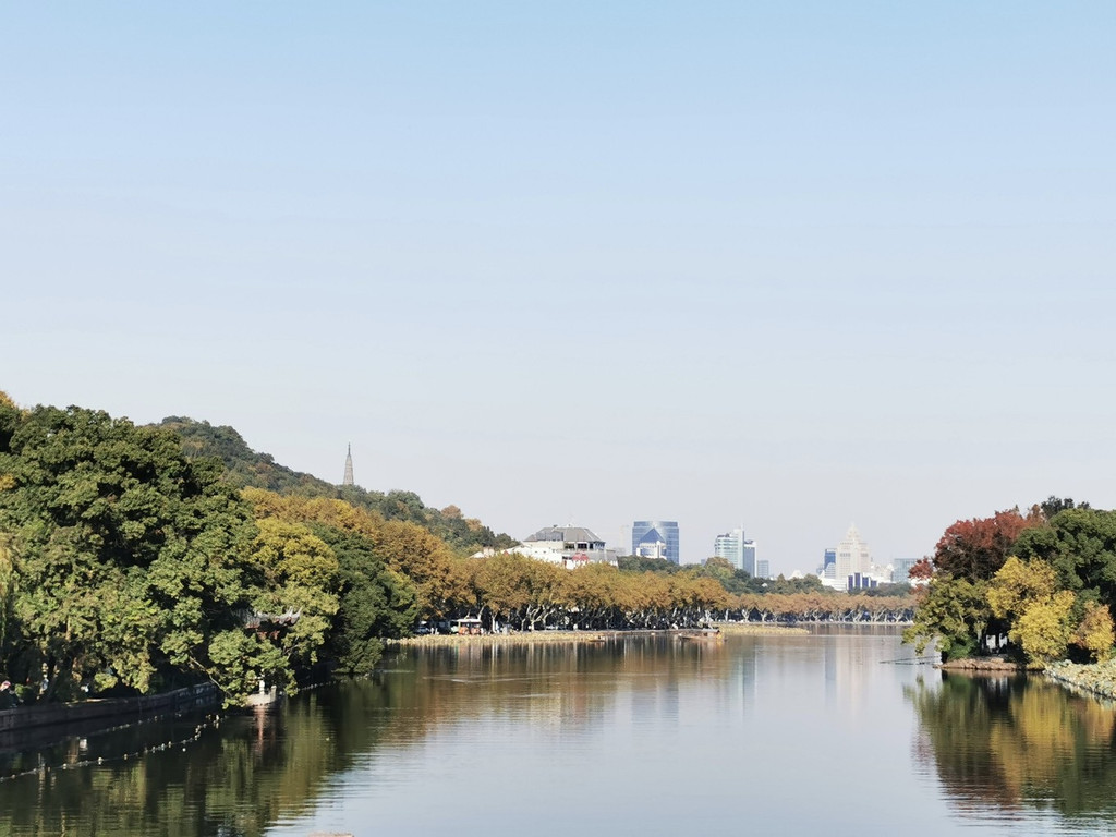 西冷桥上风景独好,一片秋色之空,遥看宝石山层林尽染
