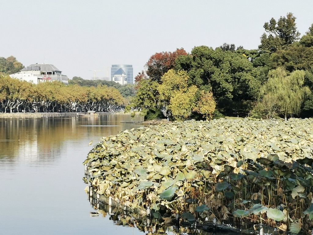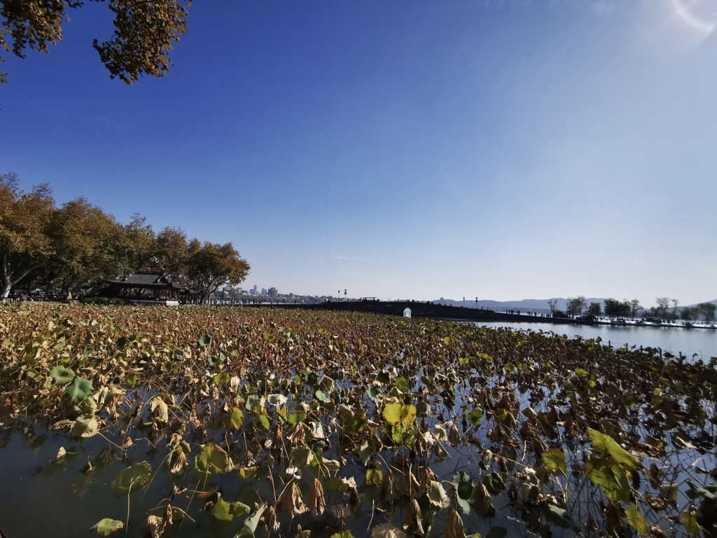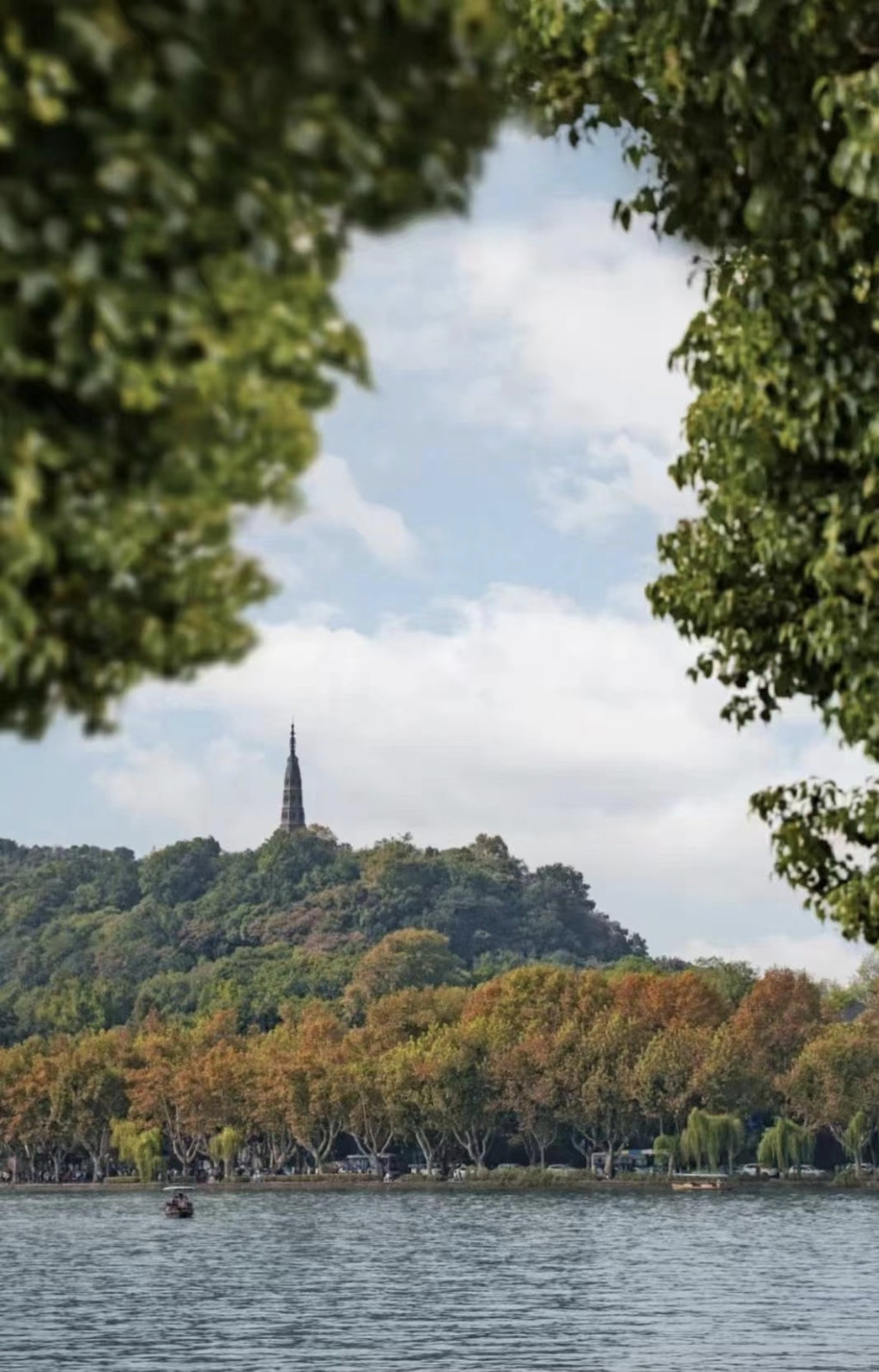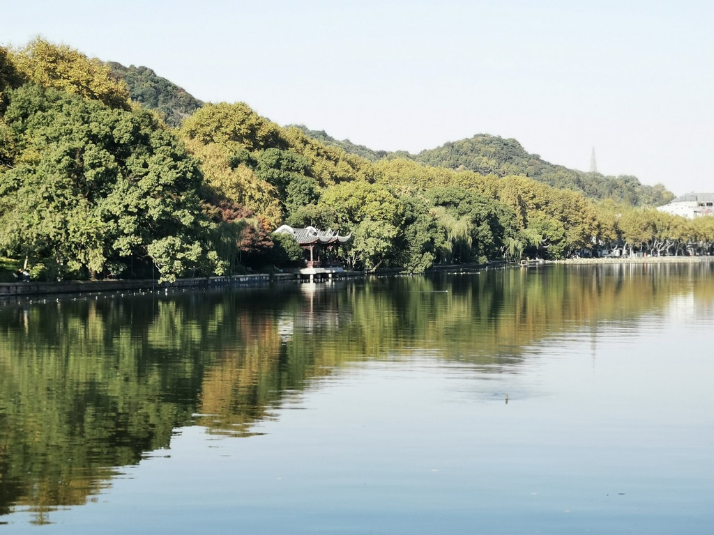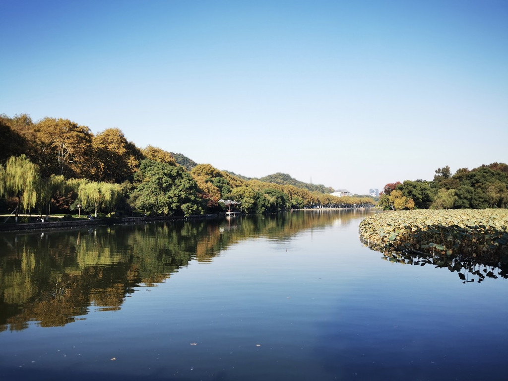 西冷桥上风景独好,一片秋色之空,遥看宝石山层林尽染