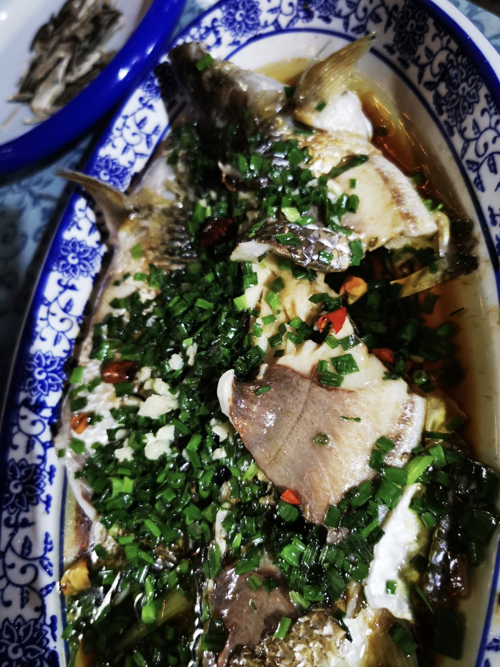 放点葱花蒜泥,然后油油锅加热后,浇淋上鱼上,这样保持着鱼肉的鲜美可口,也有青葱花的芳香回味。