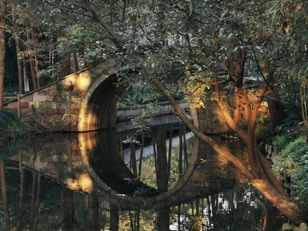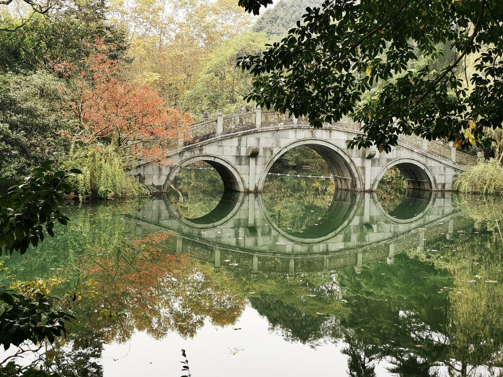 静谧的石拱桥,组成一个圆形,岸边上的红枫一抹红更是添加不少的风采,