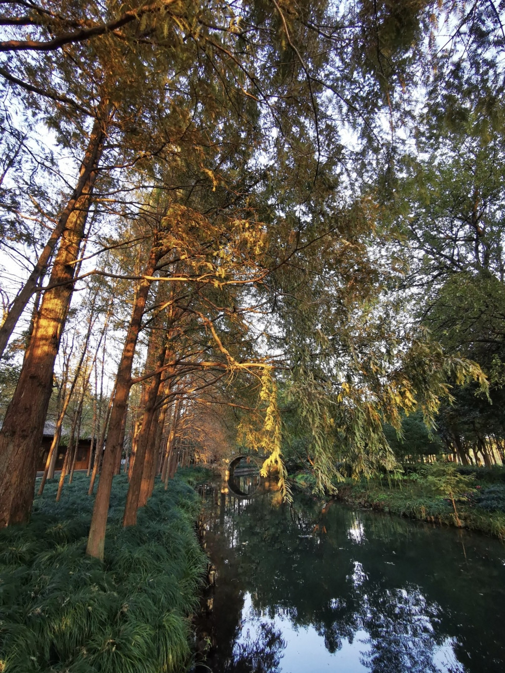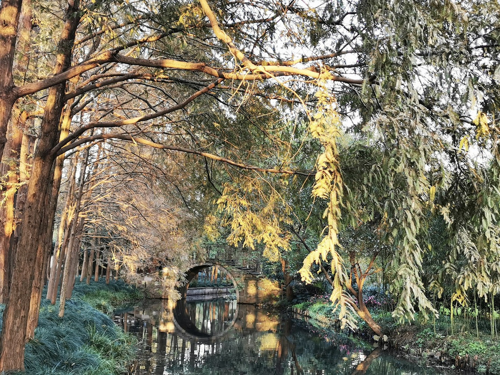 可以沿着木栈道去寻觅古桥,古桥如今已不通行,随着阳光透过树林撒入桥洞,桥洞之中也金光闪闪。