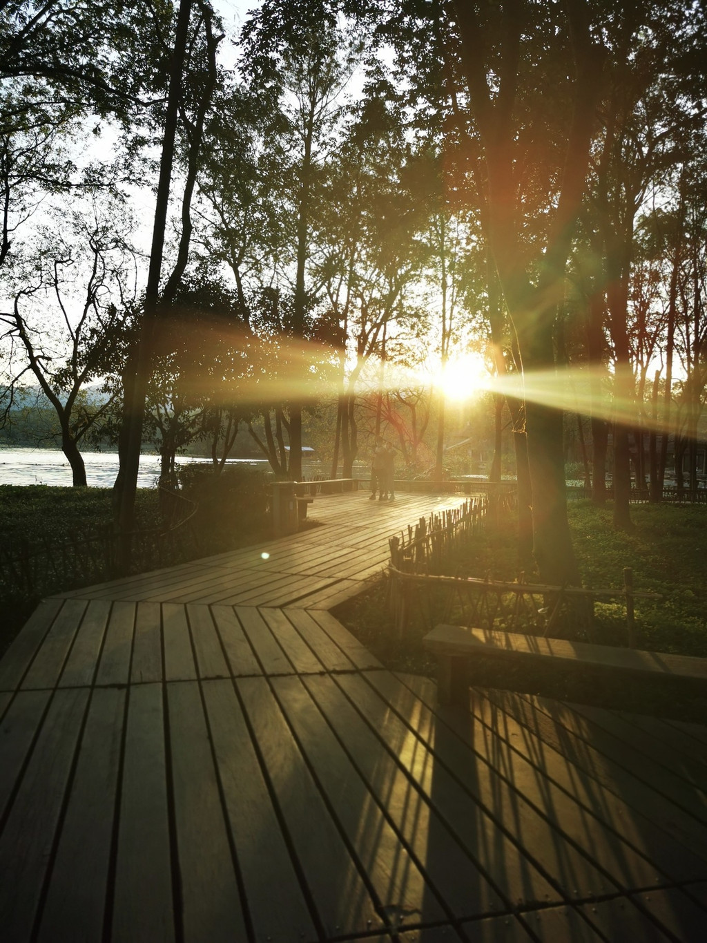 阳光透过树林,古桥也不同的景色