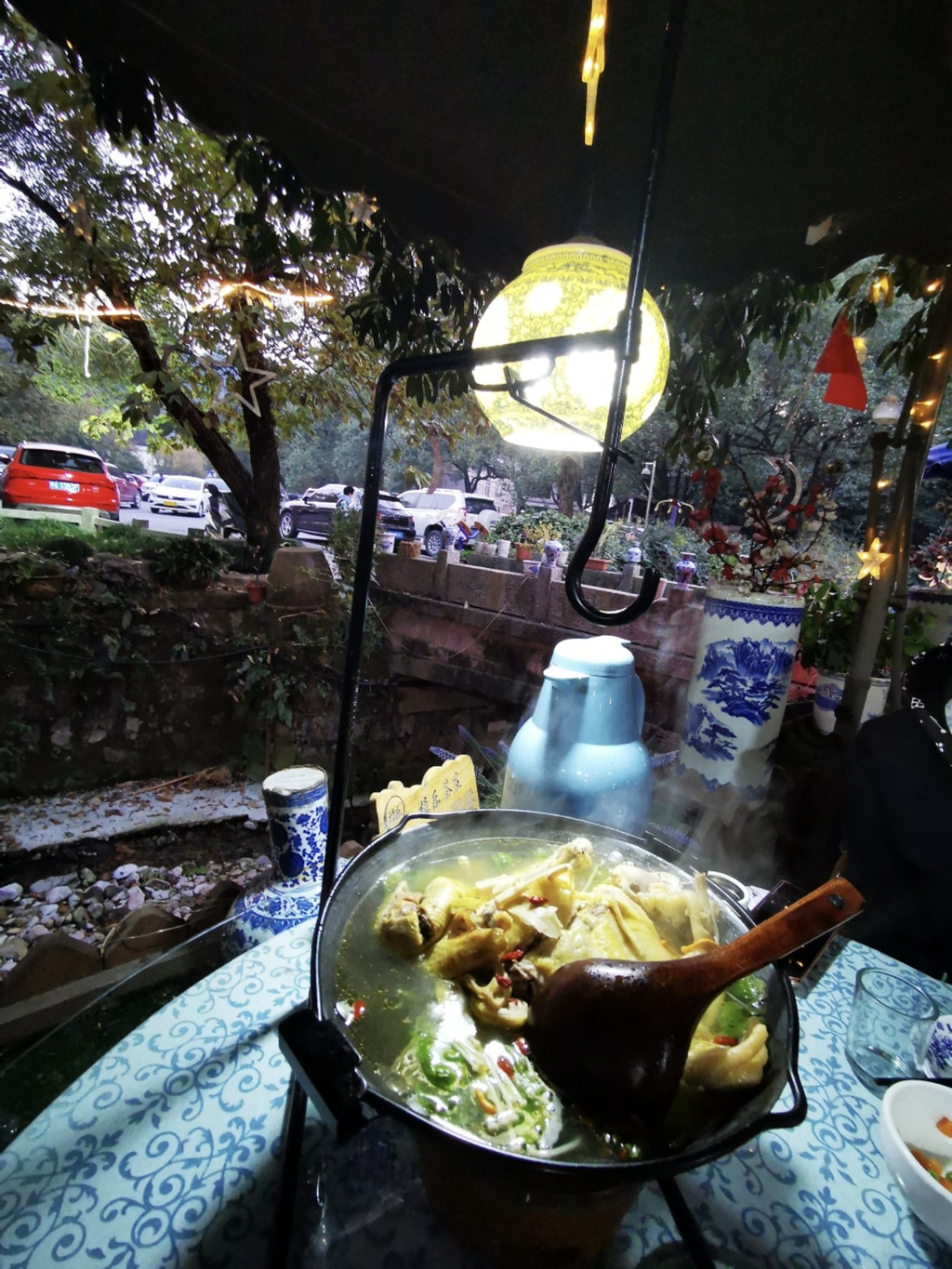 店家有非常有创意,鸡煲一边炖一边吃,下面一个小炉子一直保温,然后吃的差不多用钩子把钩挂起来,就可以吃汤,又可以吃到鸡肉,