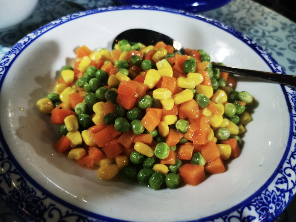 青的甜豆和黄色的玉米粒爆炒以后,就是鲜肉滑爽的一道素菜。