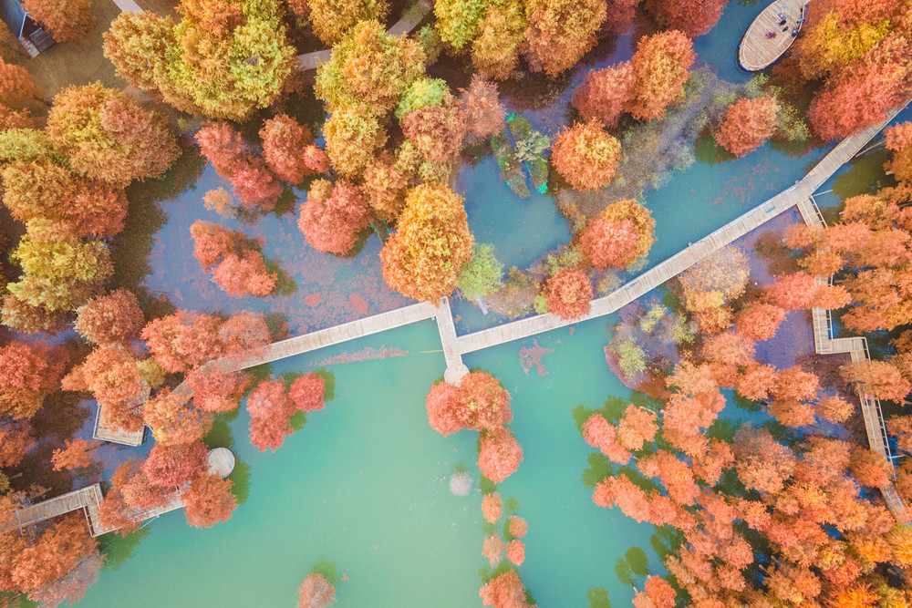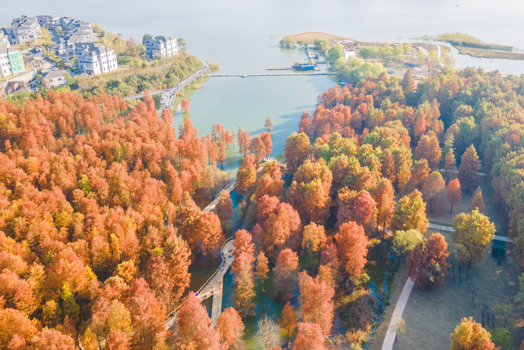 我是前天去的,湖中和湖岸的水杉全红了,不出大风大雨的话,估计还有一个星期,不用门票,不用出市,更不用出省,如果你着急着出发赶过去,没时间看完,那就先说地址路线吧: