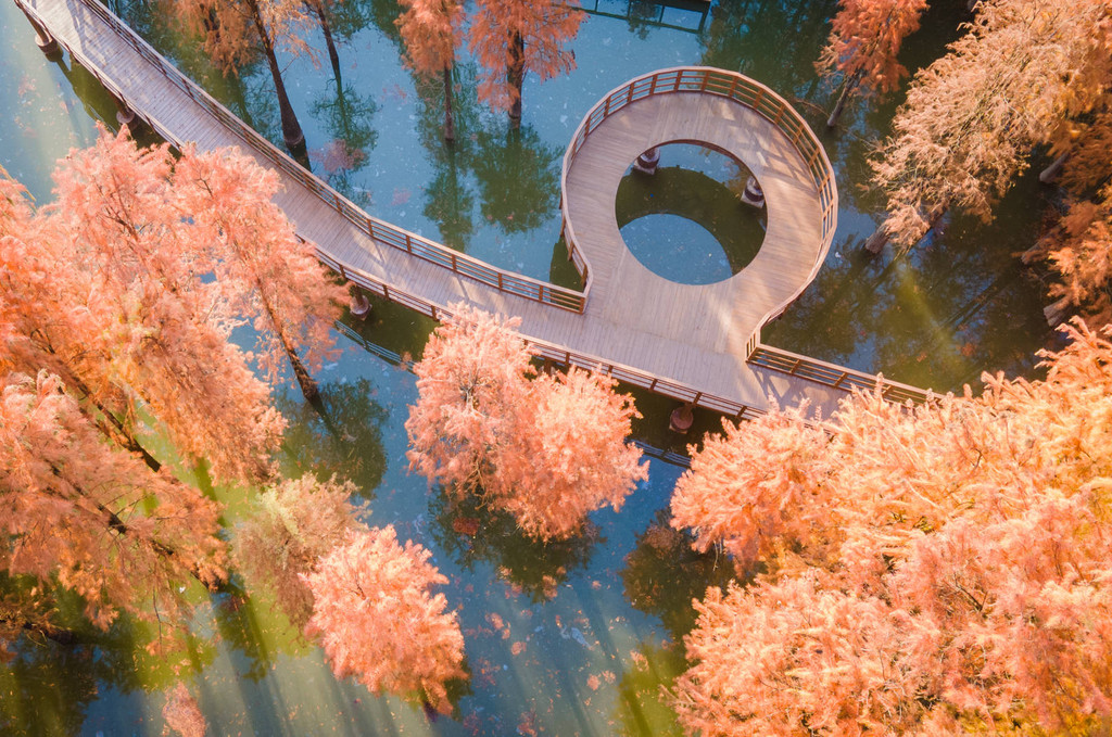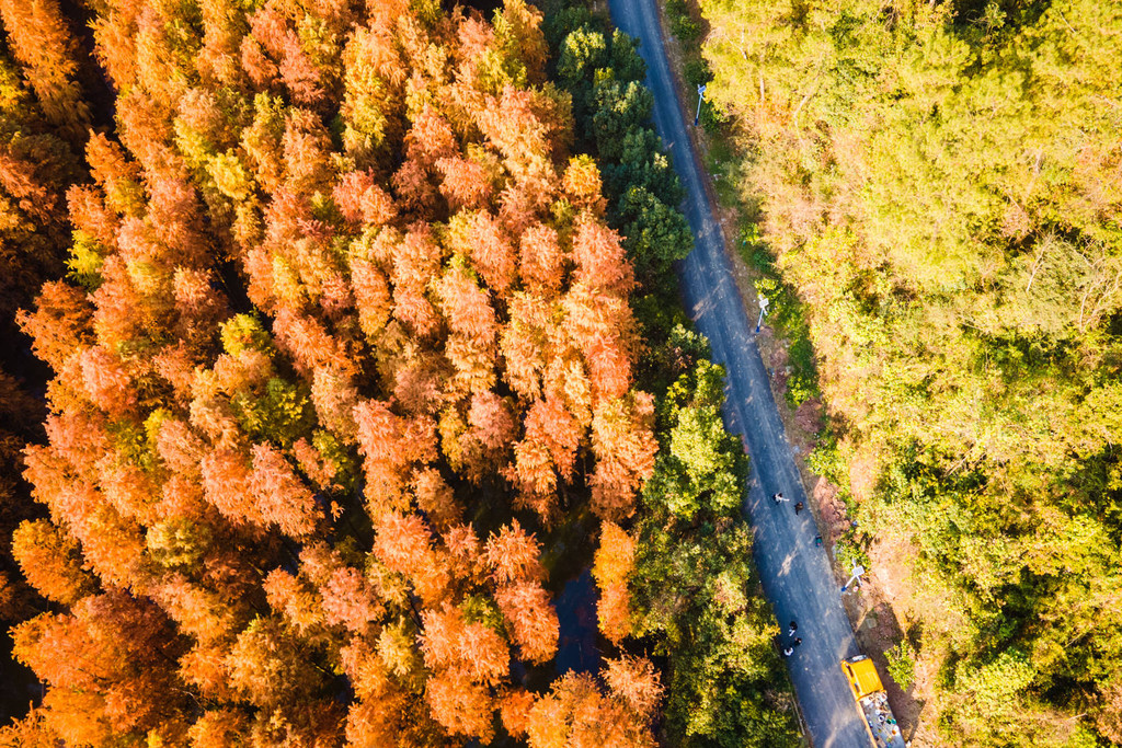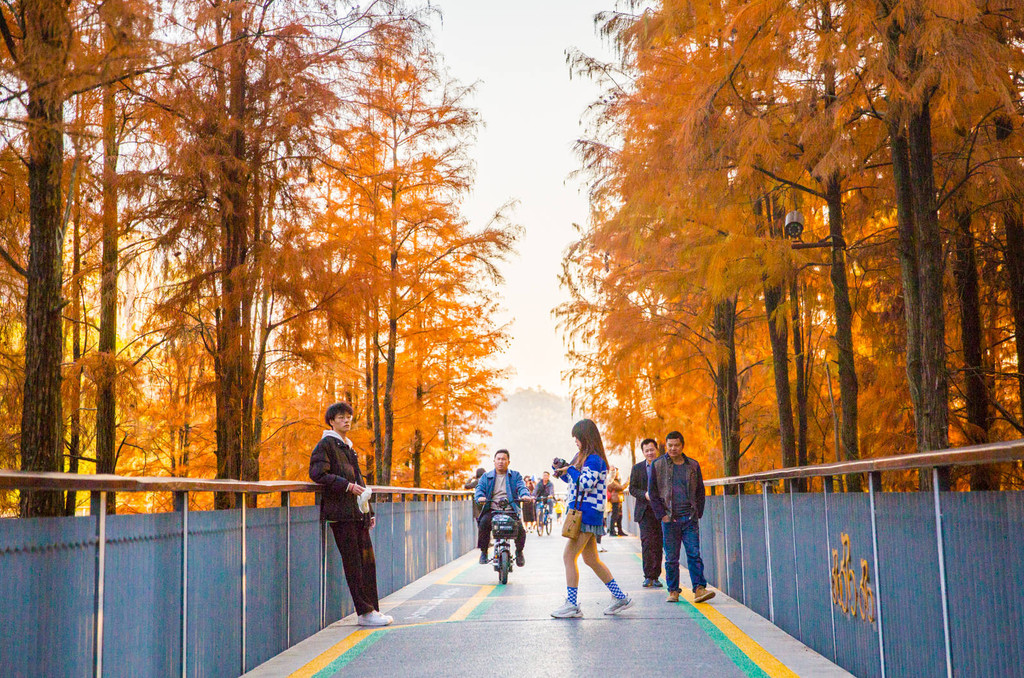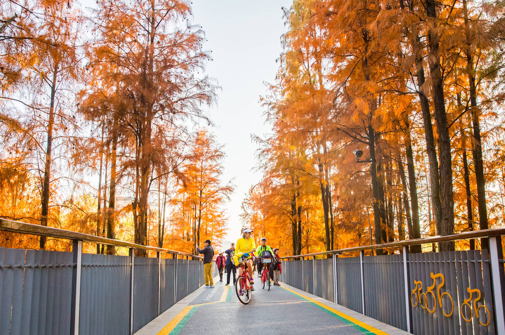 每年的11月底至12月上旬,水杉林正式进入最佳观赏期,赤橙黄绿层层叠叠,似一副秋日的油画,这是水上森林入口路段,也是青山湖绿道的起点,高大的红杉夹道,气势磅礴。