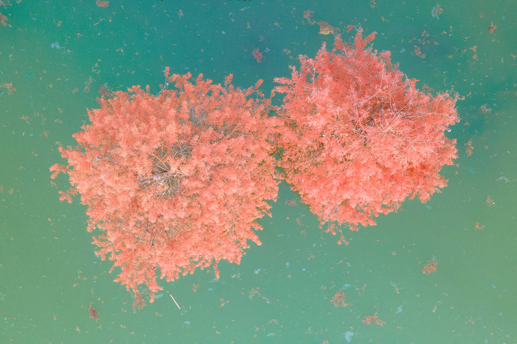看到这幅图片你一定不相信,这是红杉树吗,分明是两朵花?开始我也有点怀疑,但是在弱光之下,真的会成这样。这是杭州深秋又一打卡胜地,青山湖的水杉林景区,都红了。