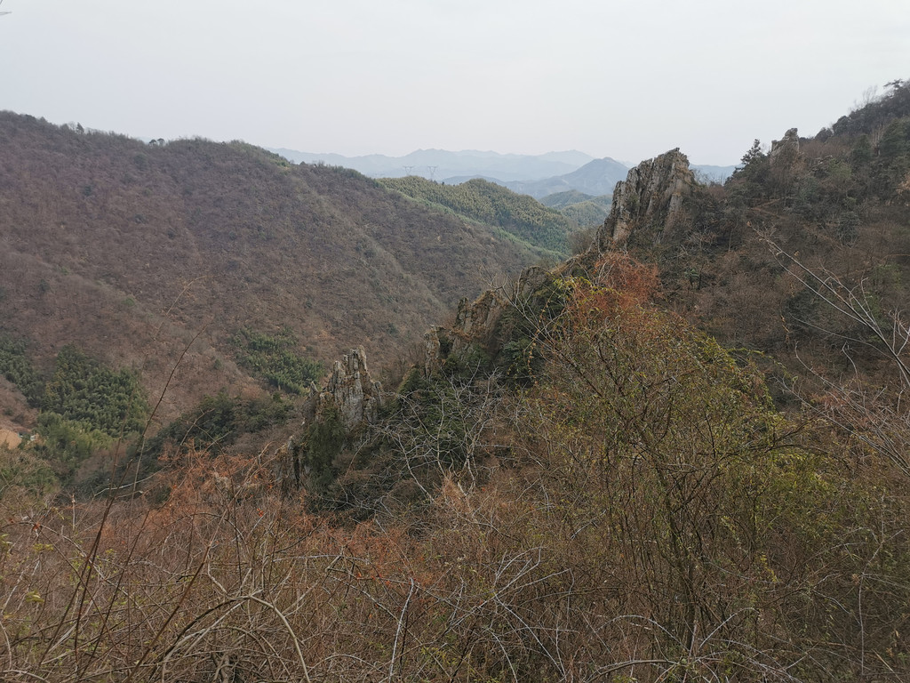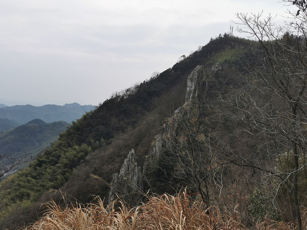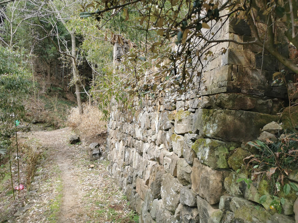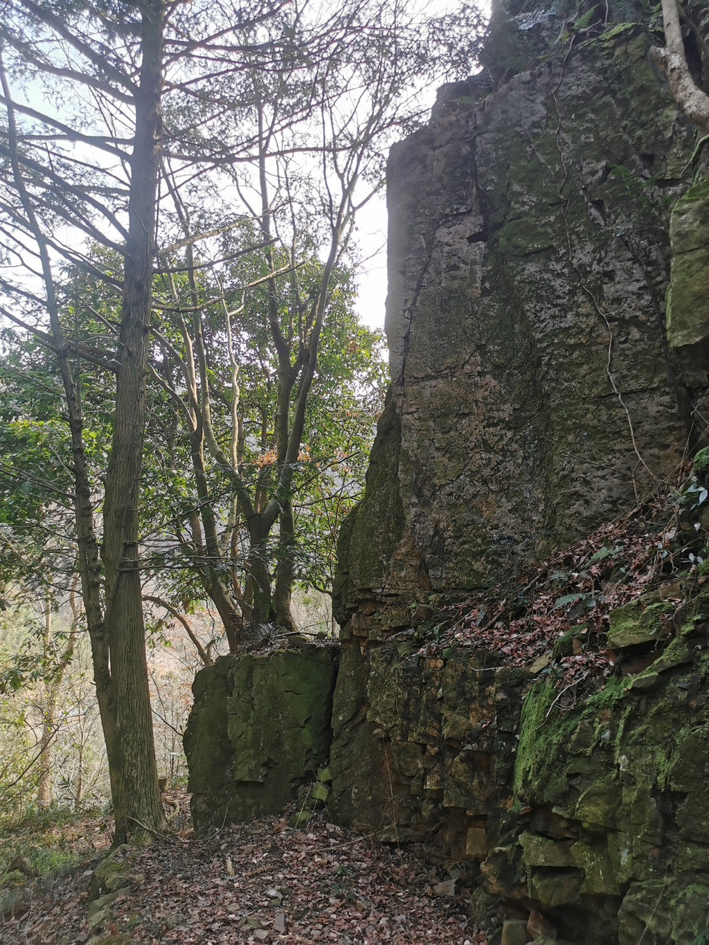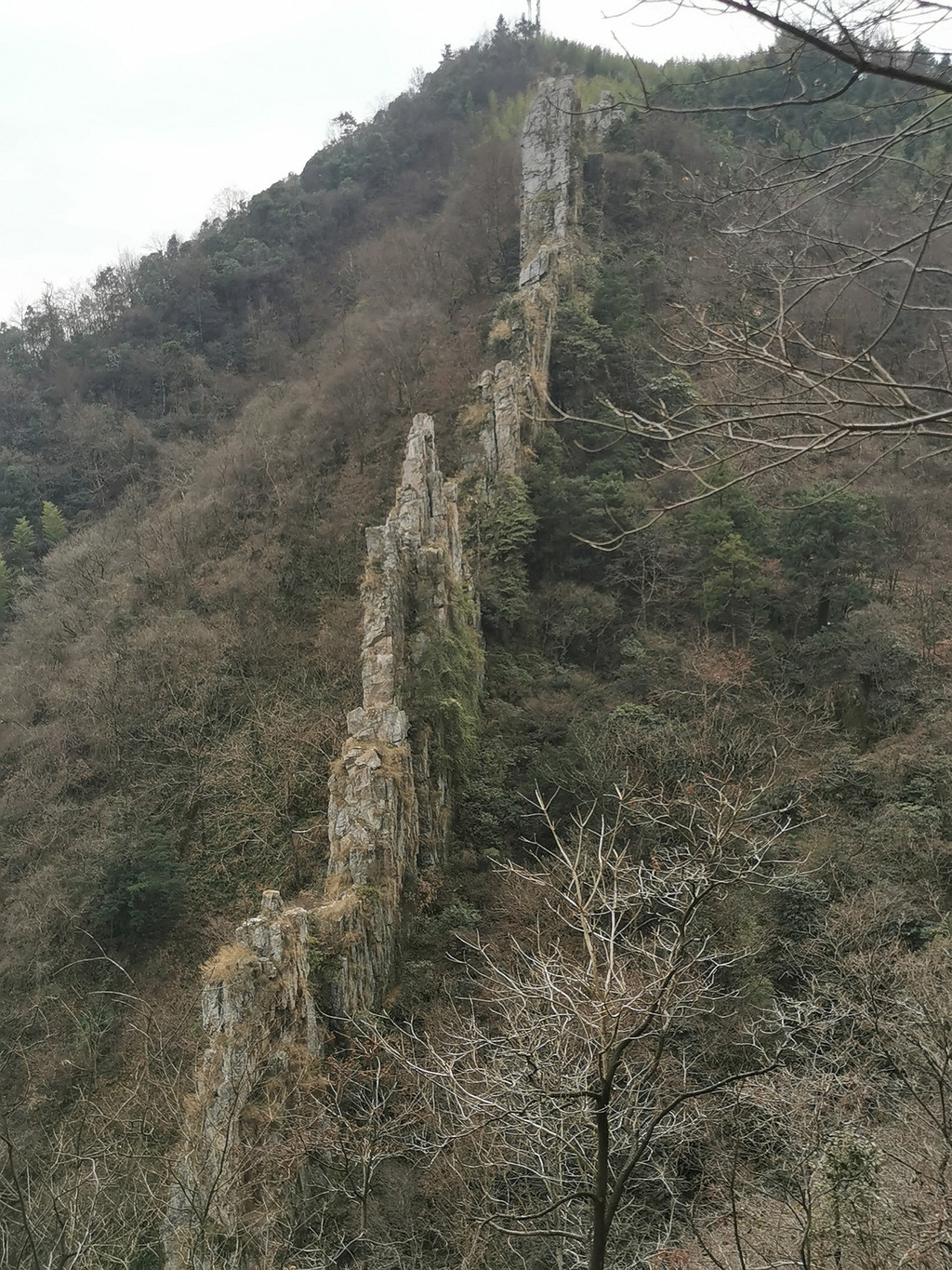 湘溪村里进去过湘河村文化礼堂,到郞家坞土地庙上山;清晨,山道青苔霜露有些湿滑,但已经有村民下山,说土地庙、云清阁以及后山的铁钟巡视看看……山道沿着清澈的溪涧,上山不远就看到峰石迂回、悬崖兀立,近山顶处就是龙鳍岩,而后面九仰坪下山绕道对面观景平台,看山脊线上跌宕起伏、蜿蜒灵动的石长城,似龙憩空谷后作势欲腾跃状,只待飞行霄汉九天……