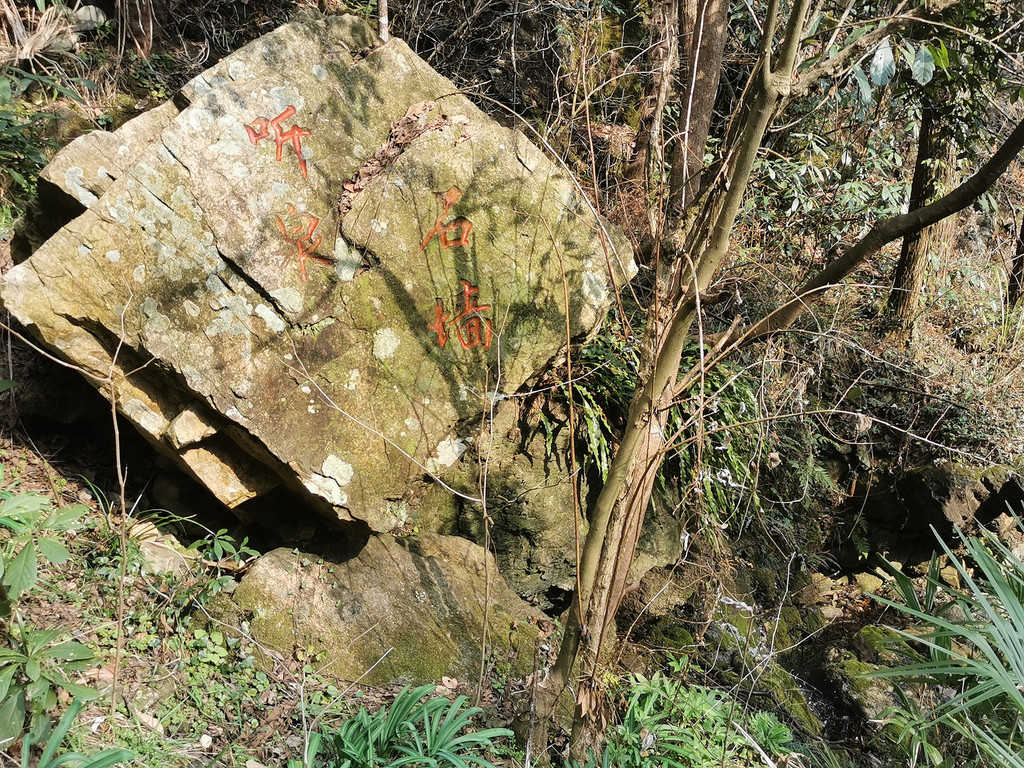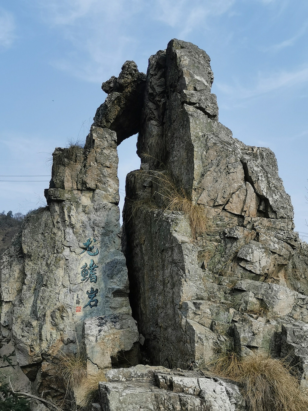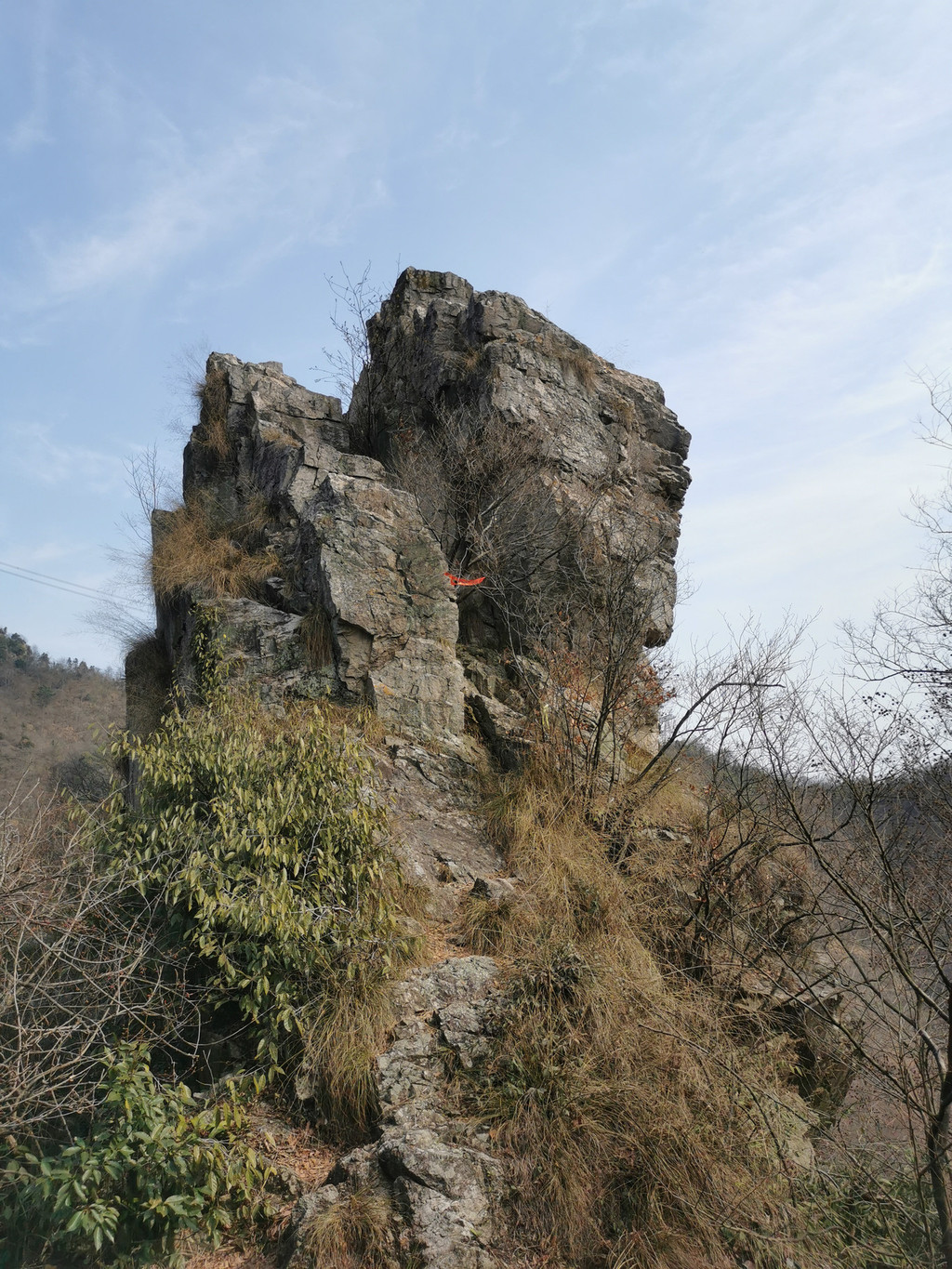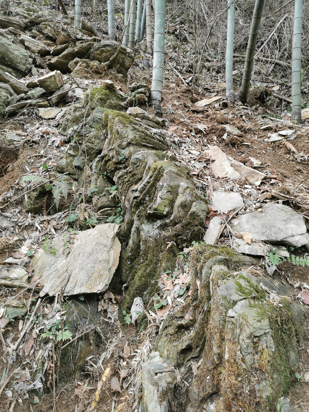 湘溪村里进去过湘河村文化礼堂,到郞家坞土地庙上山;清晨,山道青苔霜露有些湿滑,但已经有村民下山,说土地庙、云清阁以及后山的铁钟巡视看看……山道沿着清澈的溪涧,上山不远就看到峰石迂回、悬崖兀立,近山顶处就是龙鳍岩,而后面九仰坪下山绕道对面观景平台,看山脊线上跌宕起伏、蜿蜒灵动的石长城,似龙憩空谷后作势欲腾跃状,只待飞行霄汉九天……