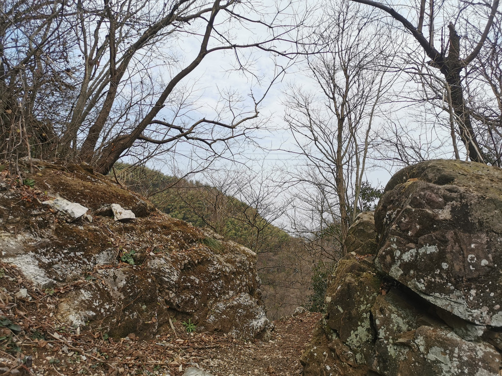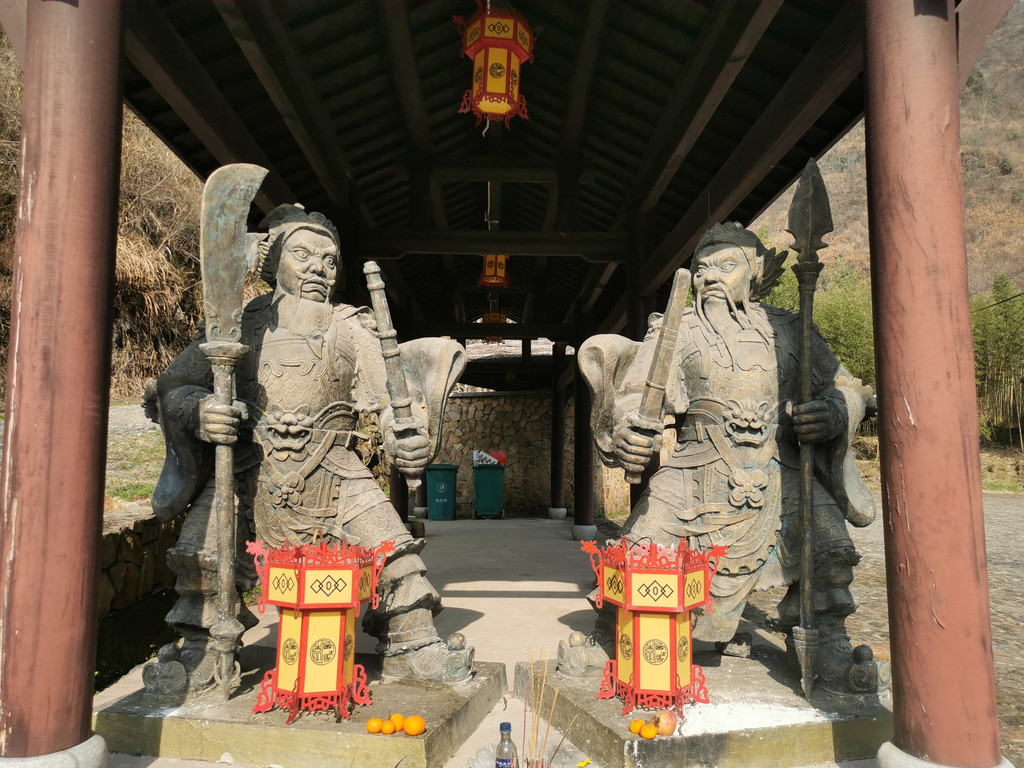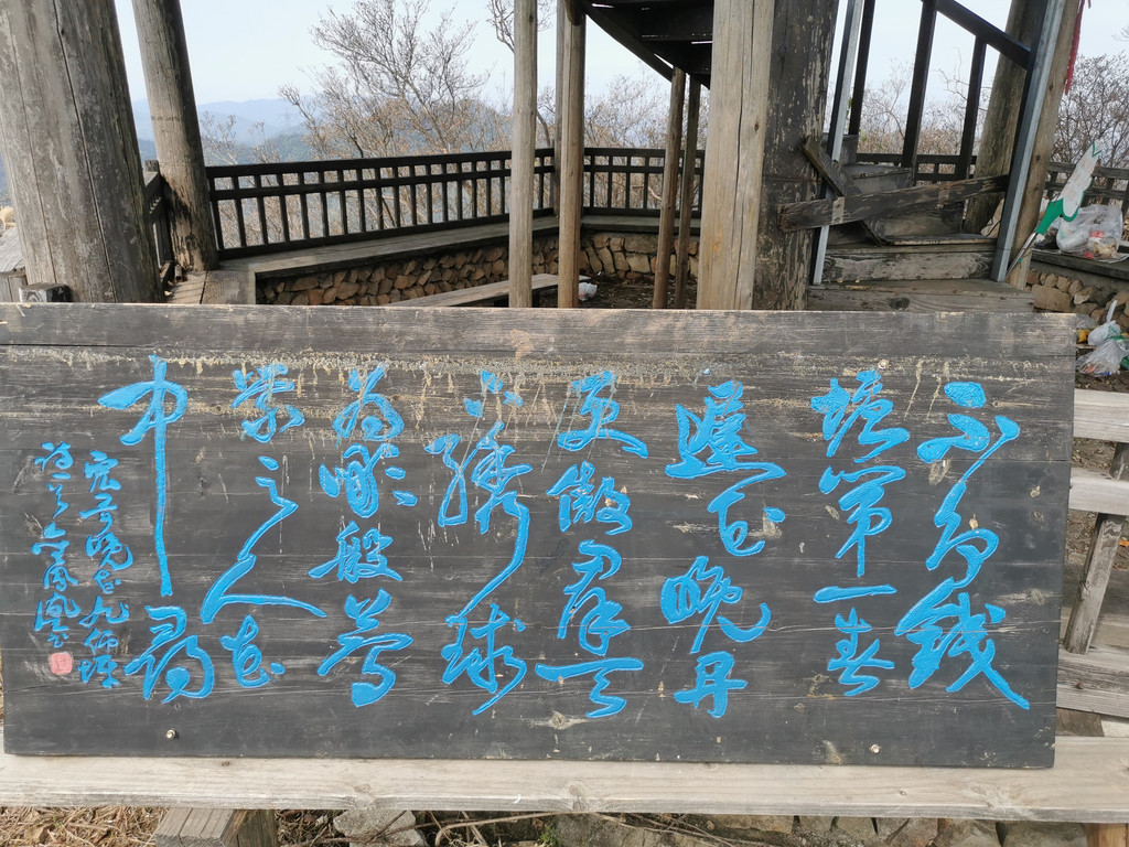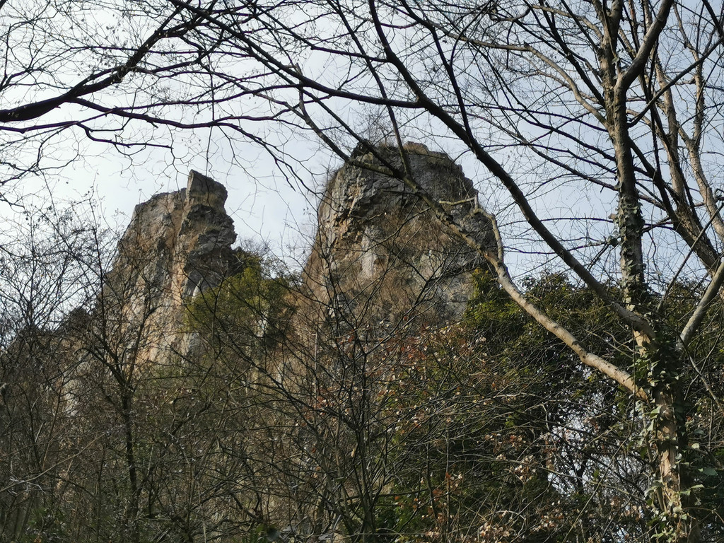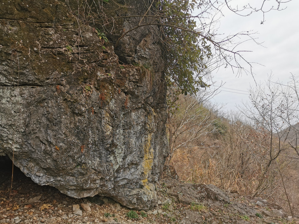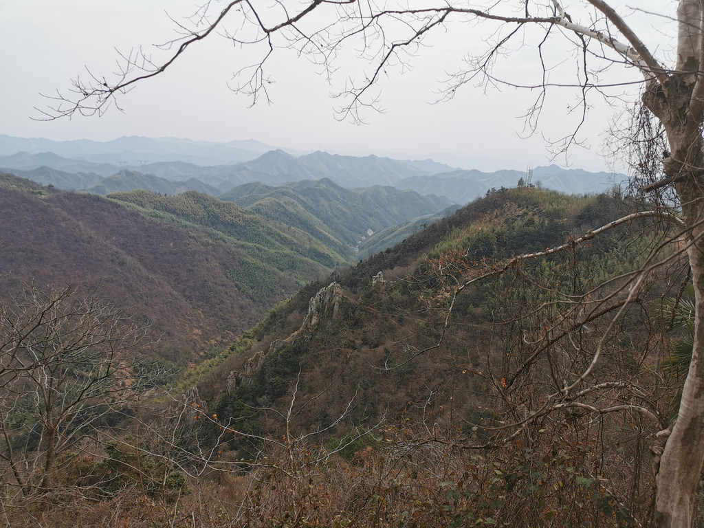 湘溪村里进去过湘河村文化礼堂,到郞家坞土地庙上山;清晨,山道青苔霜露有些湿滑,但已经有村民下山,说土地庙、云清阁以及后山的铁钟巡视看看……山道沿着清澈的溪涧,上山不远就看到峰石迂回、悬崖兀立,近山顶处就是龙鳍岩,而后面九仰坪下山绕道对面观景平台,看山脊线上跌宕起伏、蜿蜒灵动的石长城,似龙憩空谷后作势欲腾跃状,只待飞行霄汉九天……