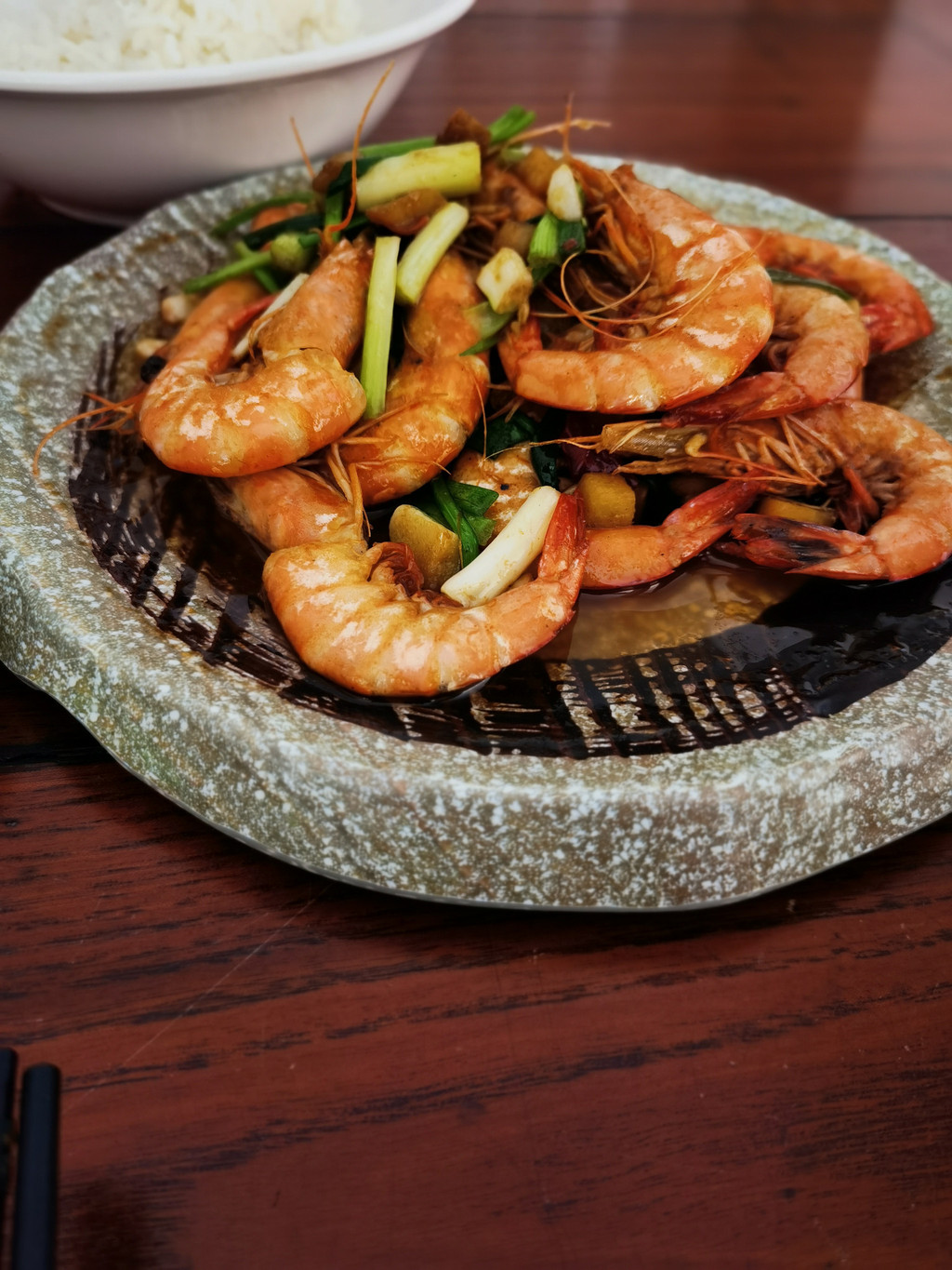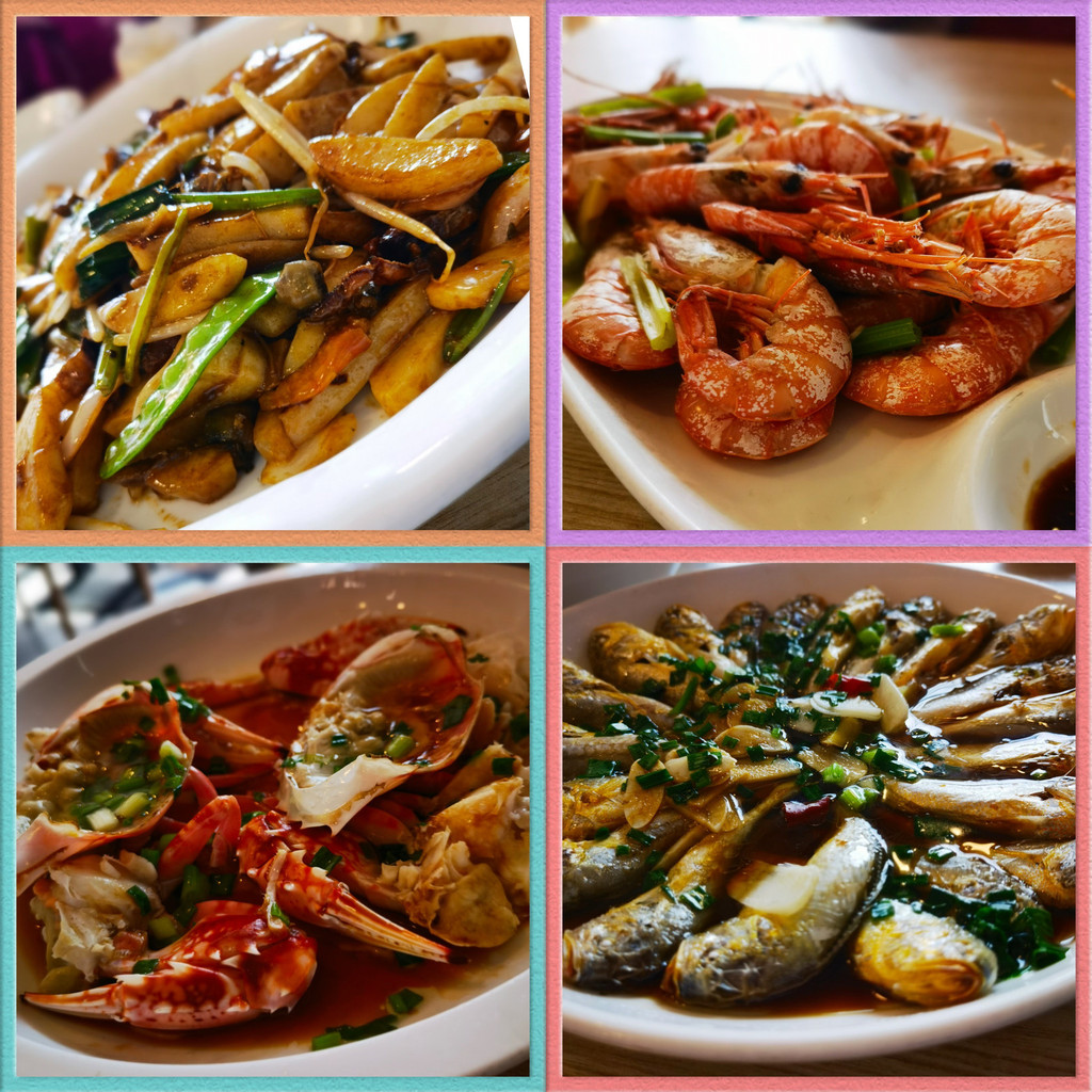 选择了一家沿岸的小店,看起来人气还挺旺盛的。店门外的小圆桌旁坐满了人,桌上堆满了被吃过的海鲜壳,一片狼藉,很有海边餐馆的氛围。