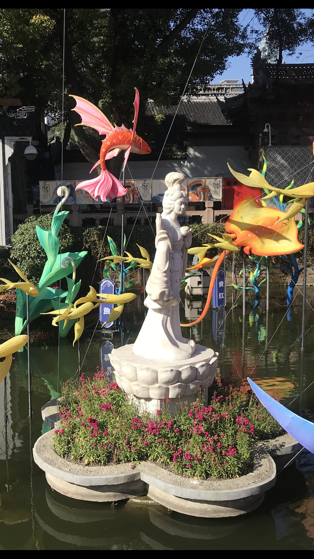 在商城里闲逛,九曲桥两侧的池塘中布满了大型花灯,店铺门前空闲处也都大张旗鼓地做了装扮,整个商城被各色彩灯装点得很有节日氛围。围着商城转了一圈,没有进豫园和城隍庙,我俩骑车回酒店休息了。